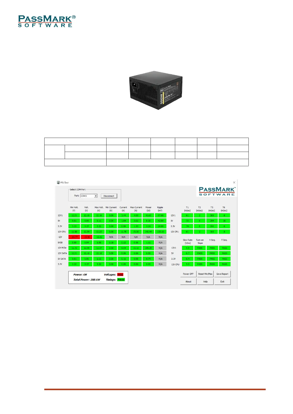 - Voltages were within the specification except for the -12V rail which went outside