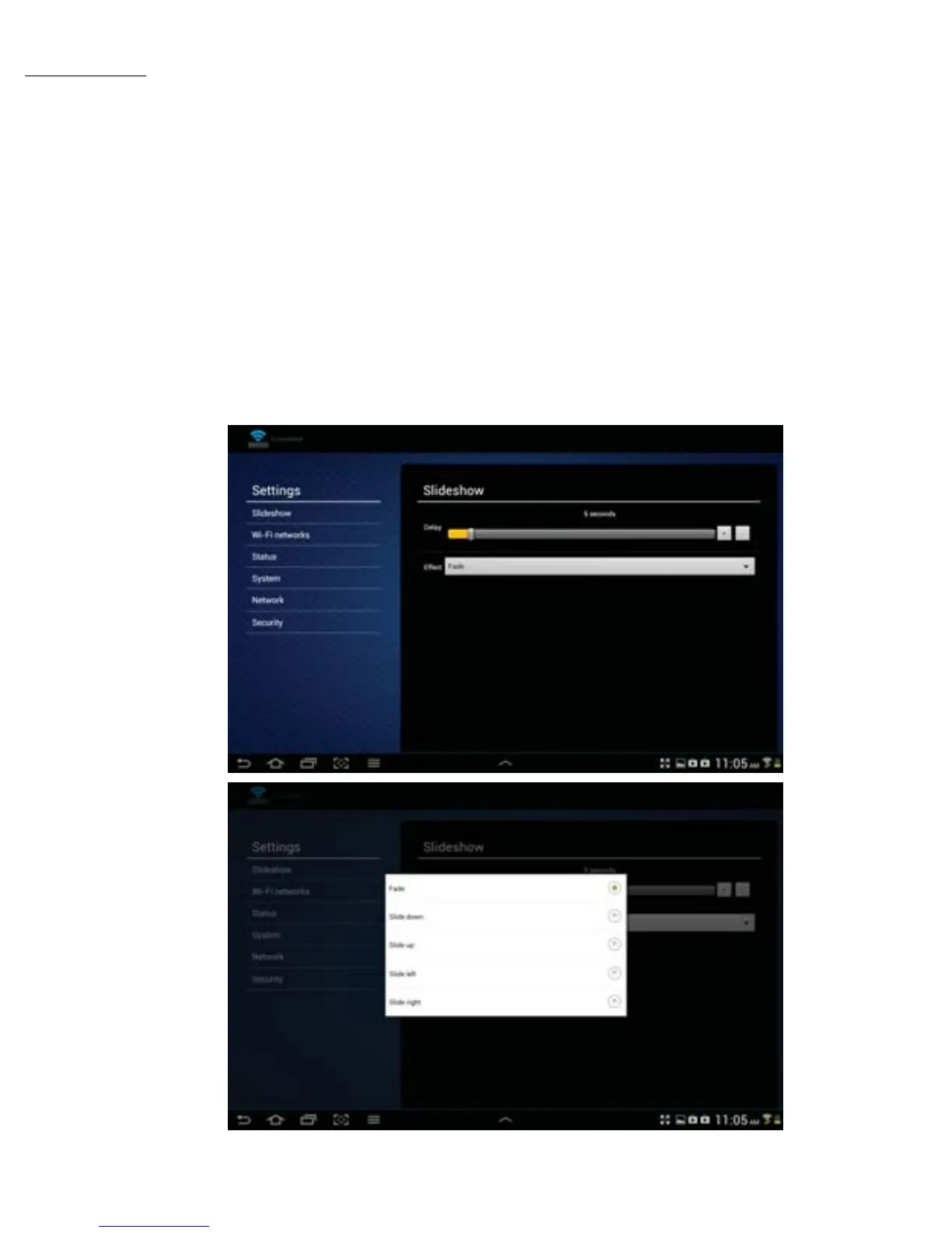 Slideshow Type: Tap this box to change the visual eect mode for each photo as it