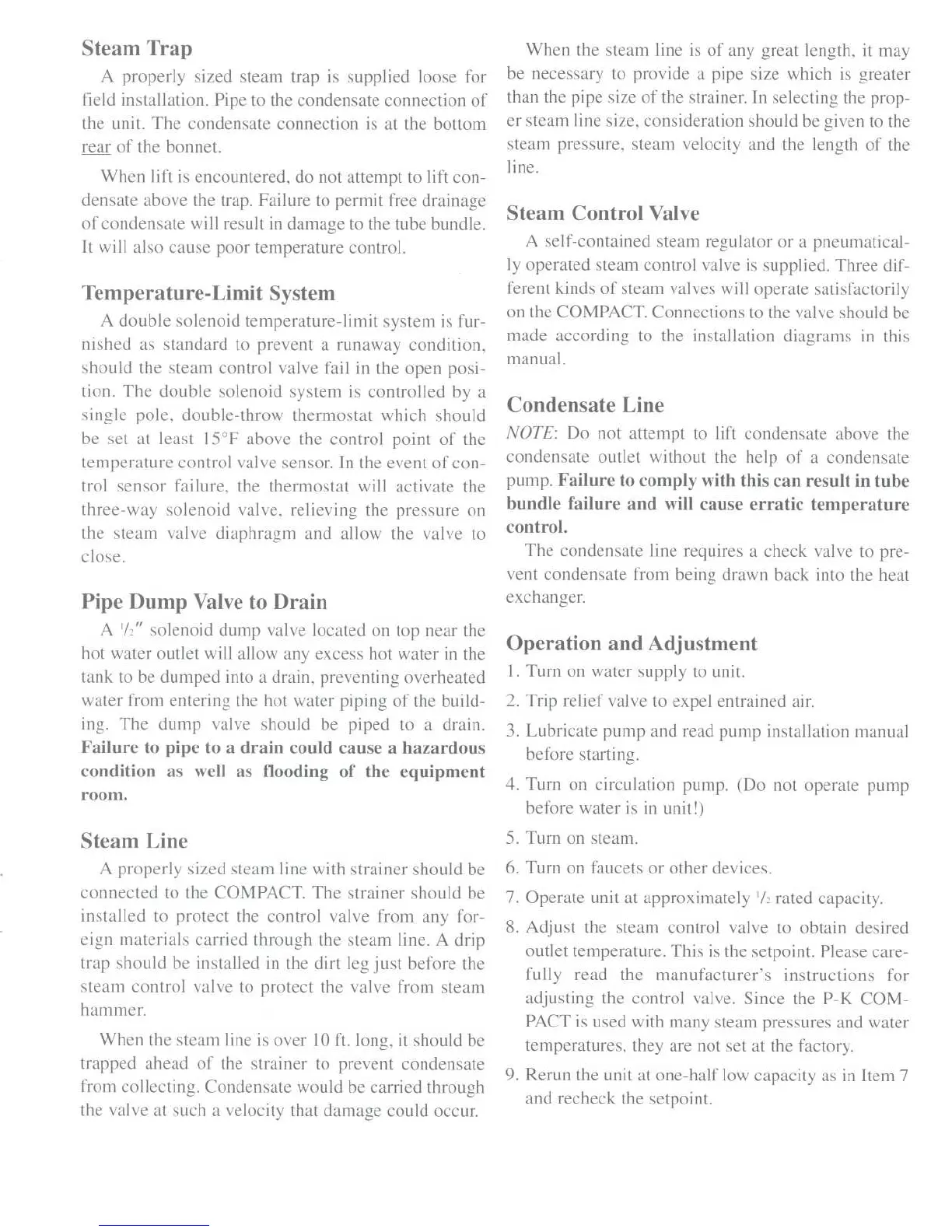 Patterson-Kelley P-K Compact - P-K COMPACT Water Heater - System Components and Setup; Steam Trap and Condensate Management; Temperature-Limit System and Controls; Steam Line and Control Valve Setup
