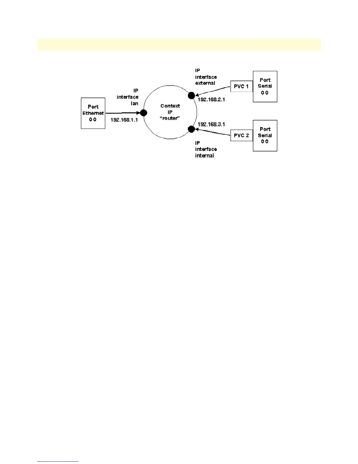 Figure 30. IP Context with logical IP interfaces bound to Ethernet port, serial port PVC 1 and PVC 2