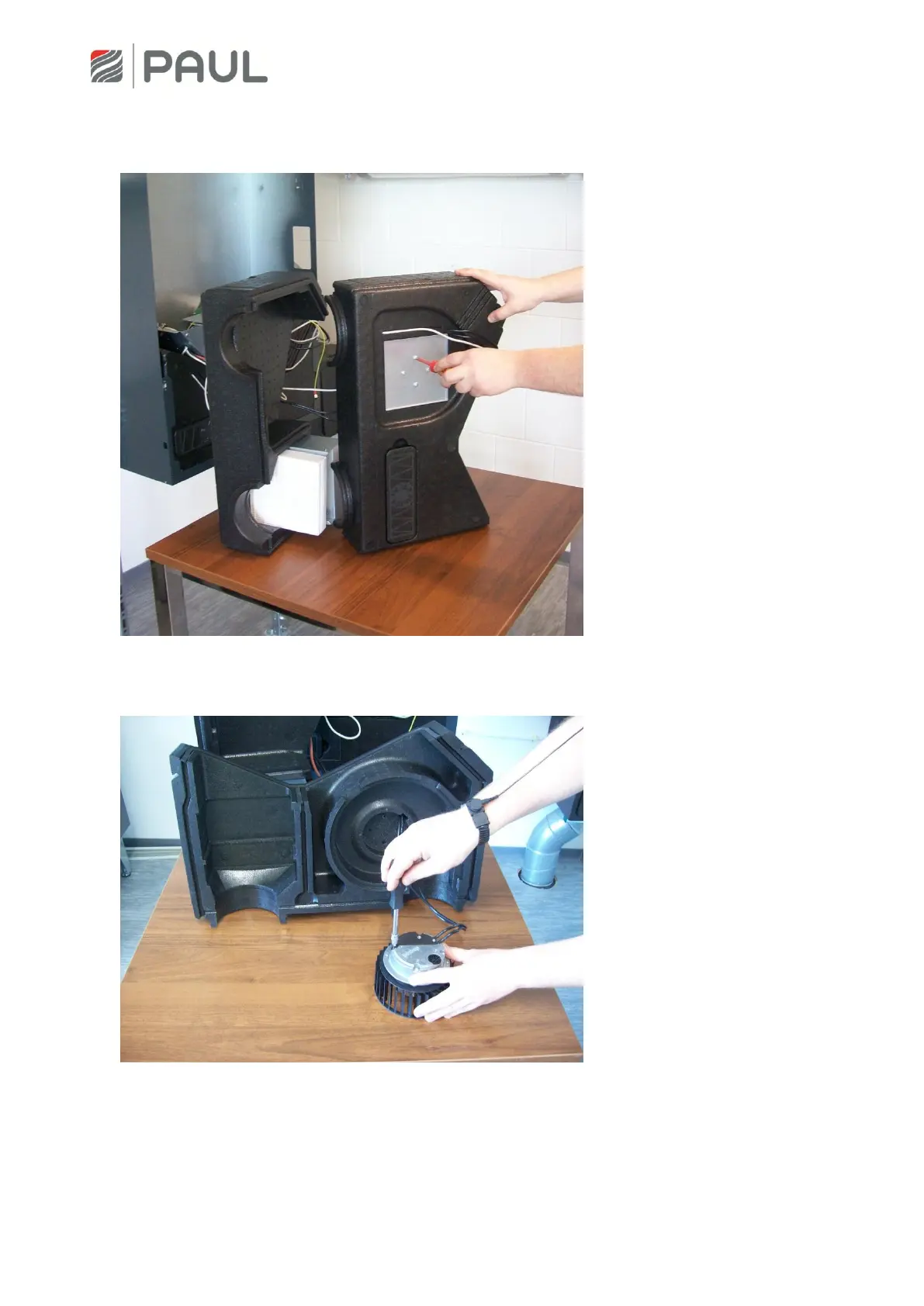 13. Loosen the screws of the fan holder plate and remove the fan out of the spiral casing.