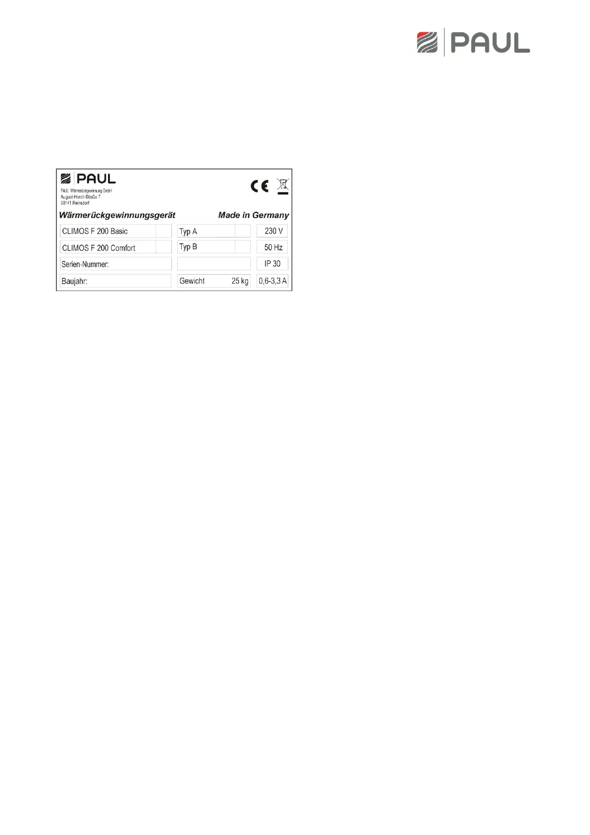 Paul CLIMOS F 200 Basic - 1 Type Plate