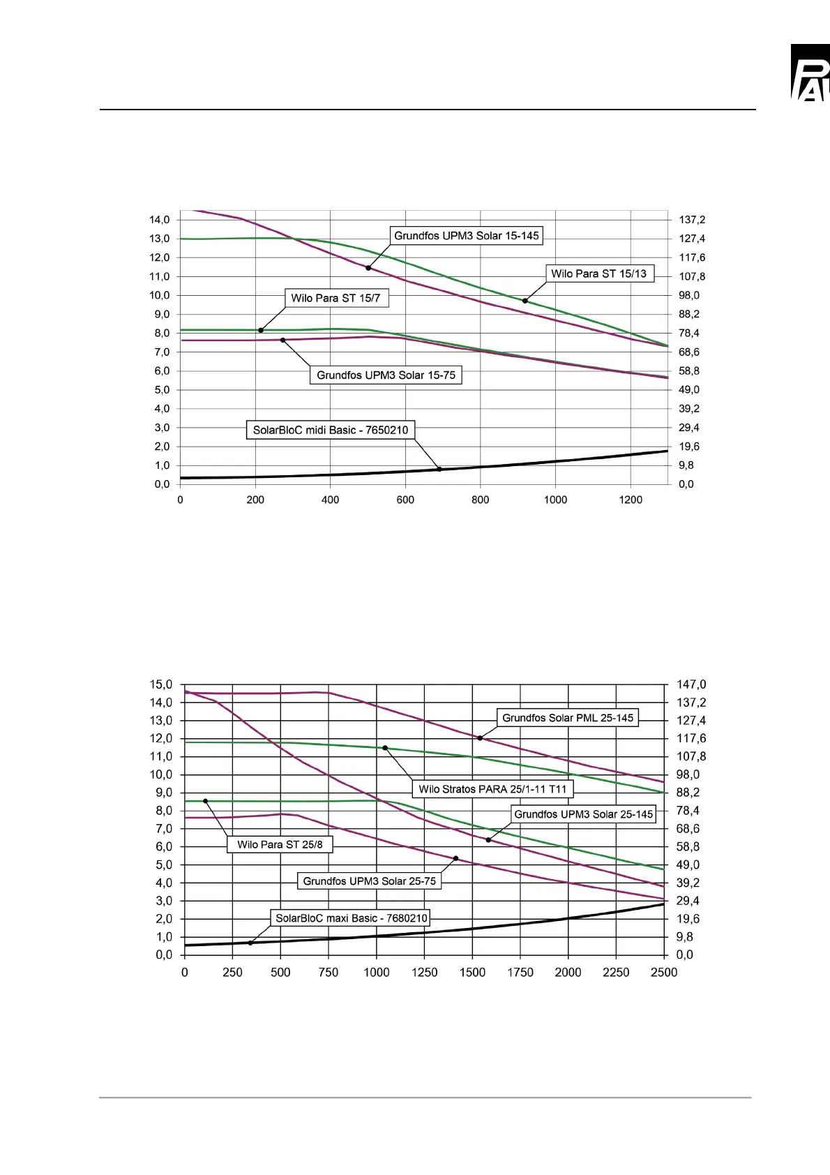 PAW SolarBloC midi Basic DN 20 - Pressure Drop and Pump Characteristic Curve Solarbloc MIDI Basic DN 20; Pressure Drop and Pump Characteristic Curve Solarbloc Maxi Basic DN 25