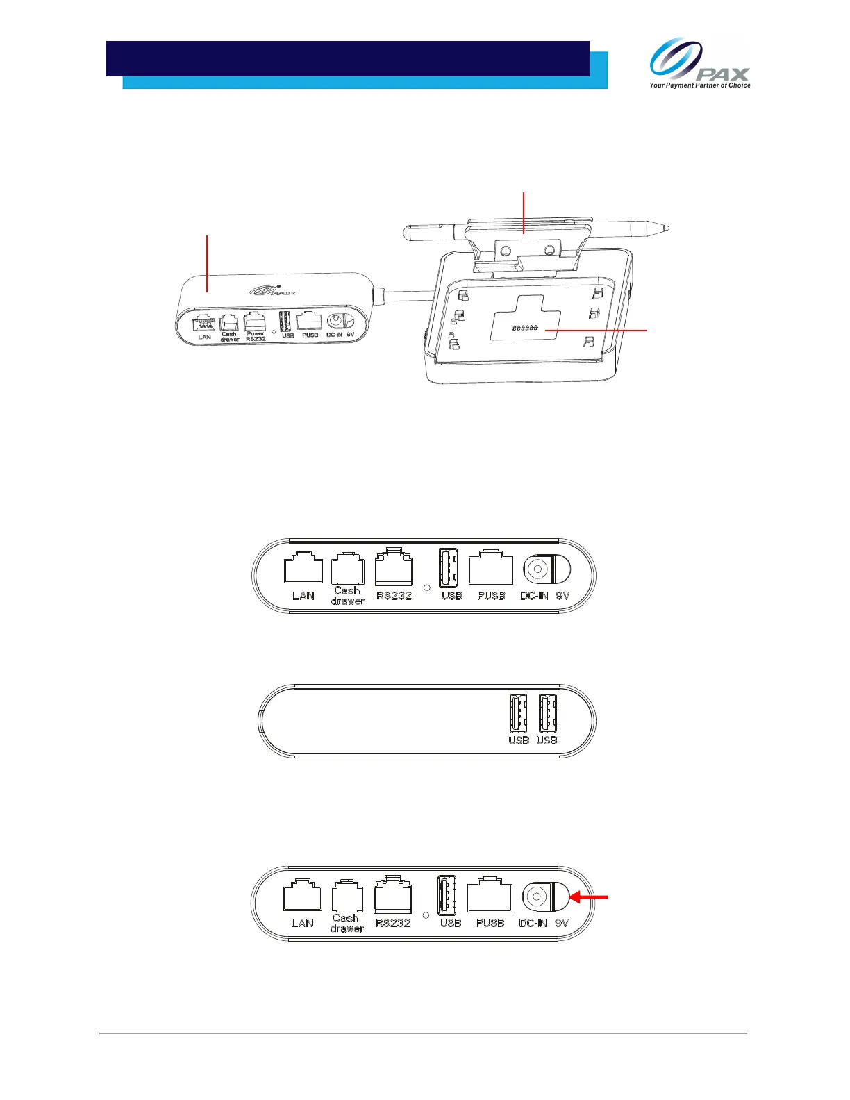 ports: LAN, Cash Drawer, Power (RS232), USB, PUSB, and DC-IN 9V.