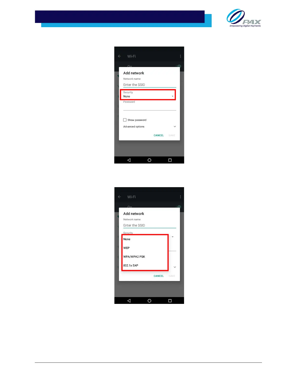 8. Select the security type from the pull-down menu. Selections include WPA/WPA2