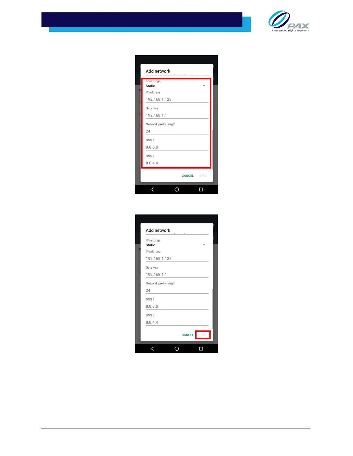 15. Enter the [IP address], [Gateway], [Network prefix length], [DNS 1], and [DNS 2].