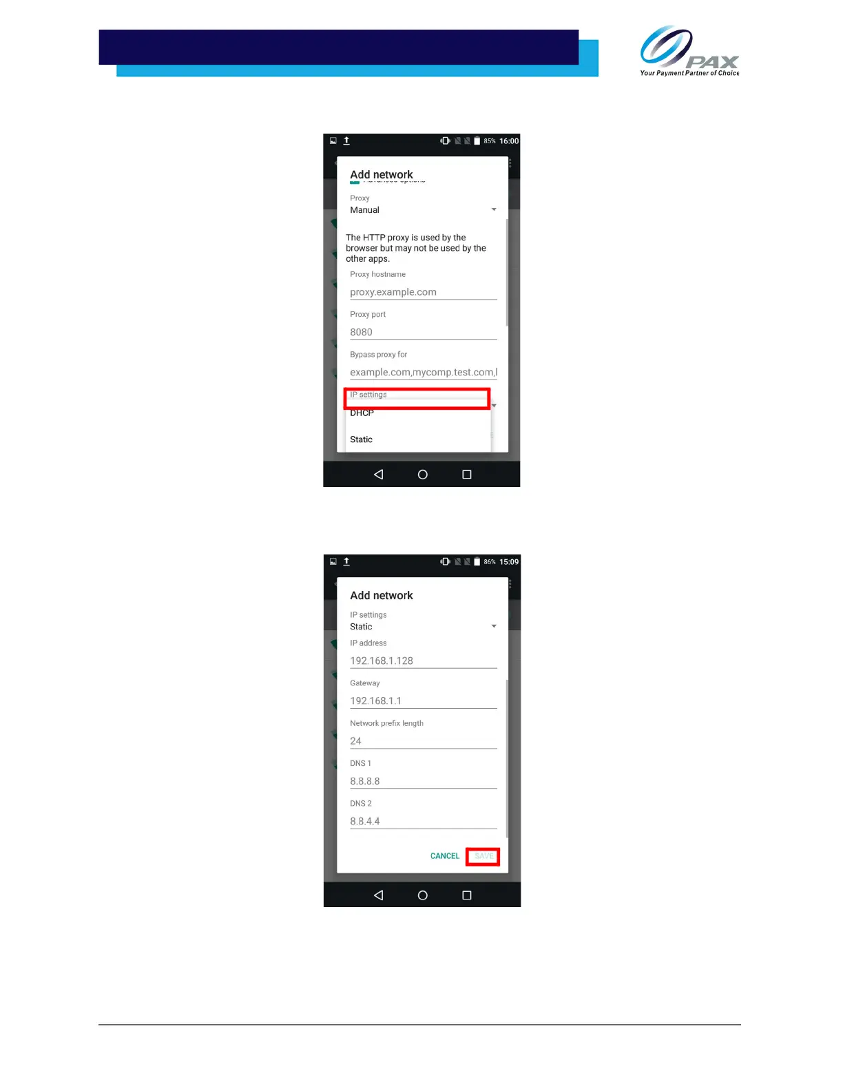 9. Enter the IP address, Gateway, Network prefix length, DNS 1, and DNS 2. Once all