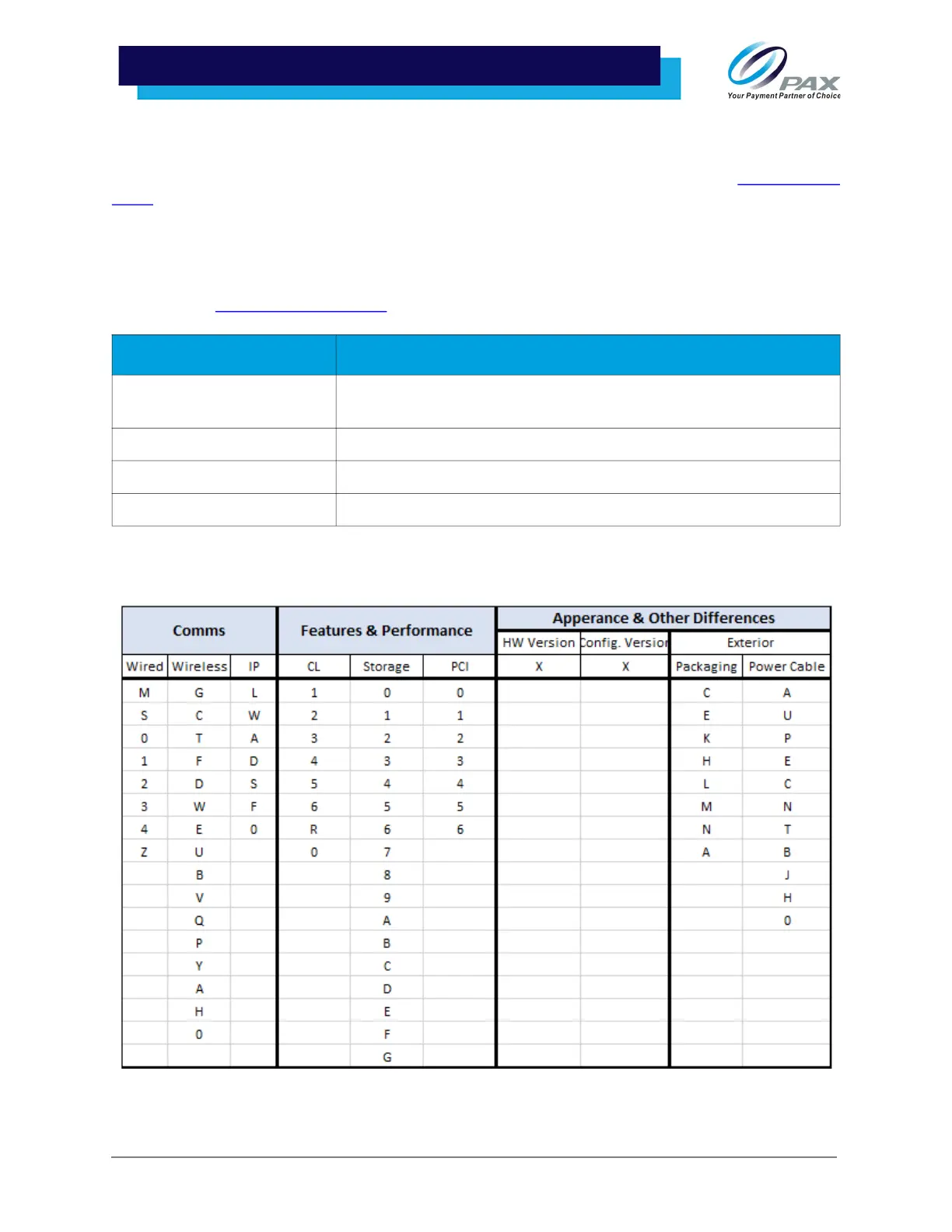 All PAX device part number keys and their corresponding definitions are configured by device type. For an