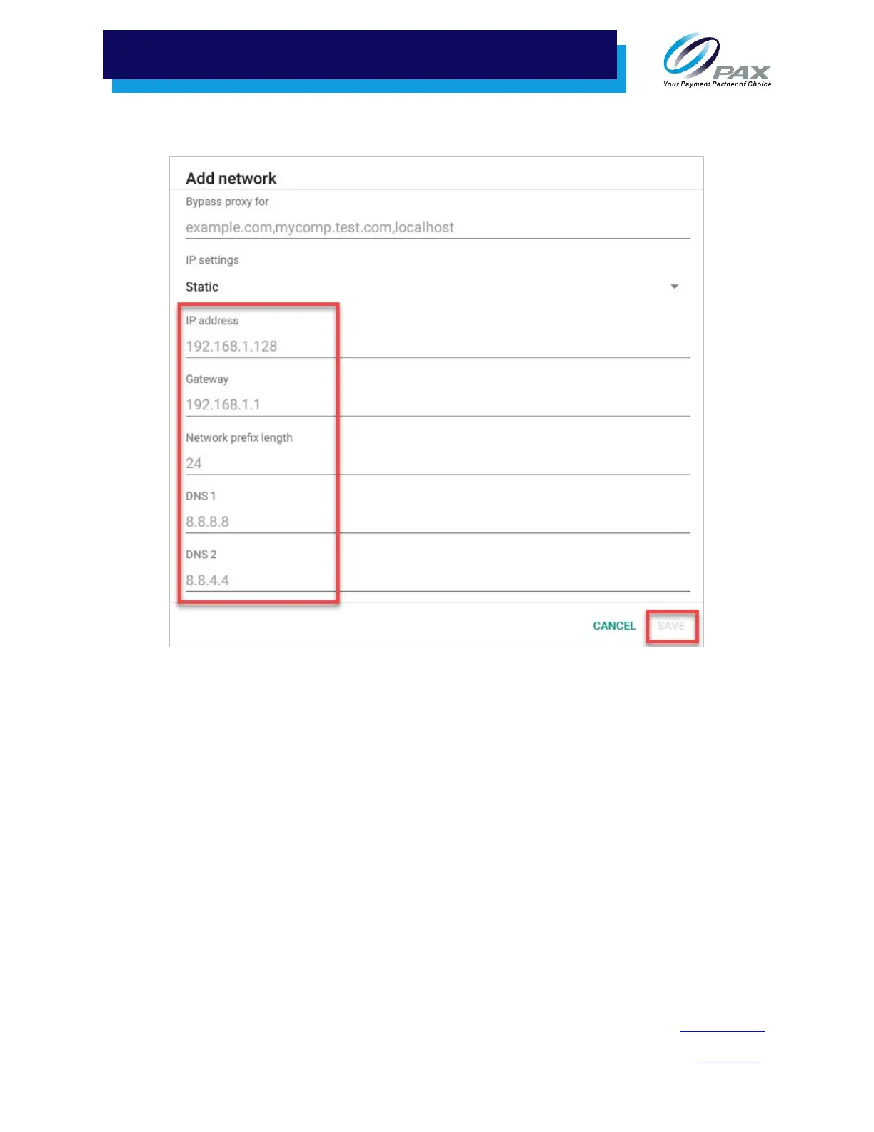 16. Scroll down to enter the IP address, Gateway, Network prefix length, DNS 1, and DNS 2.