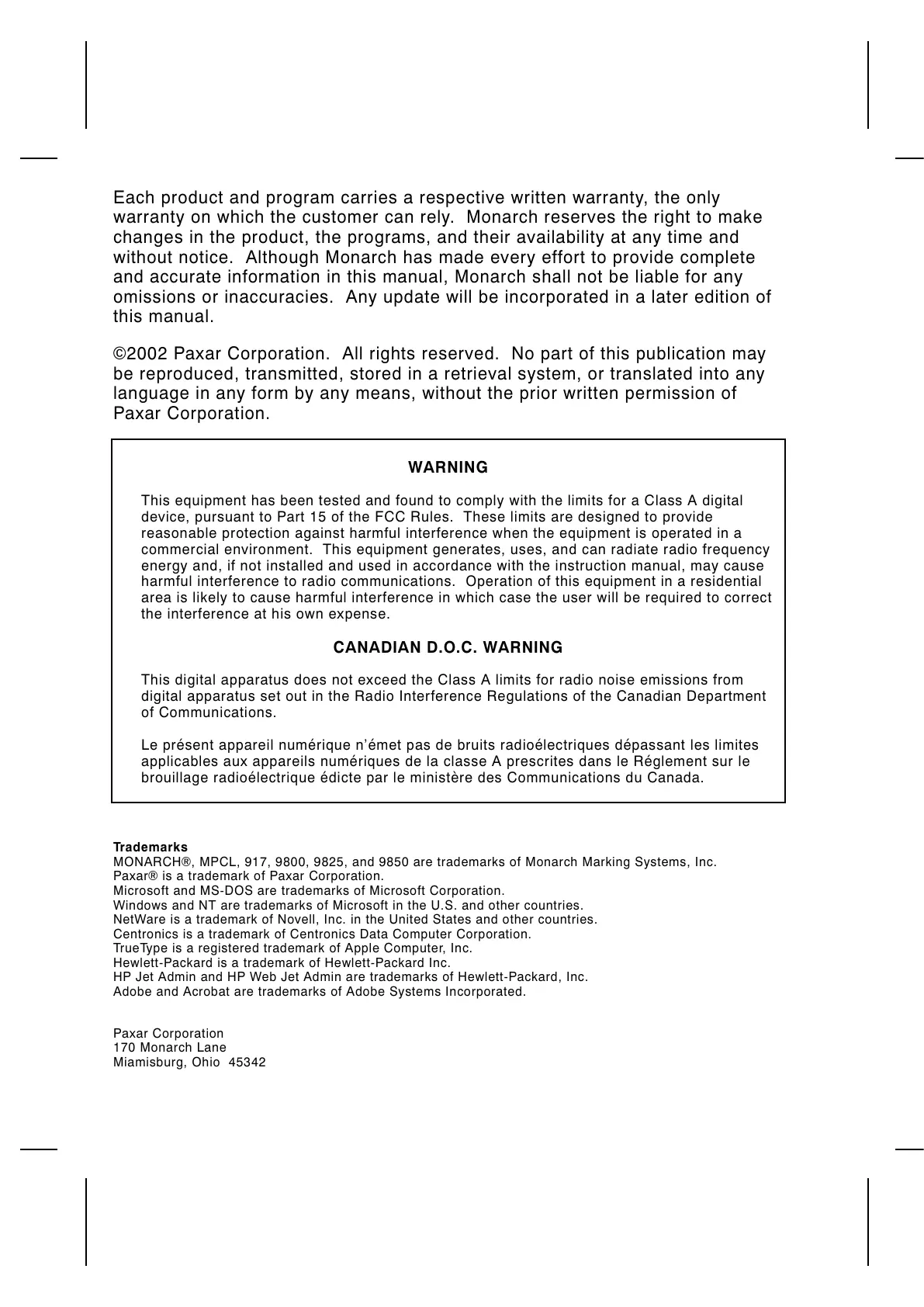 ©2002 Paxar Corporation. All rights reserved. No part of this publication may