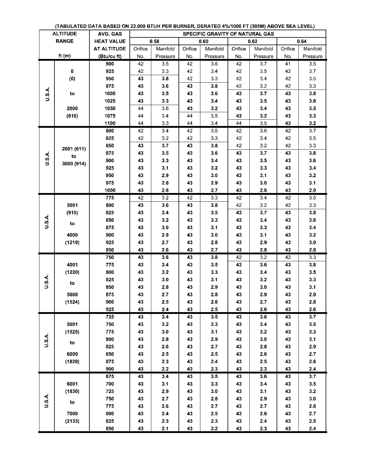 Table 12 Orifice Size* and Manifold Pressure (In. W.C.) for Gas Input Rate