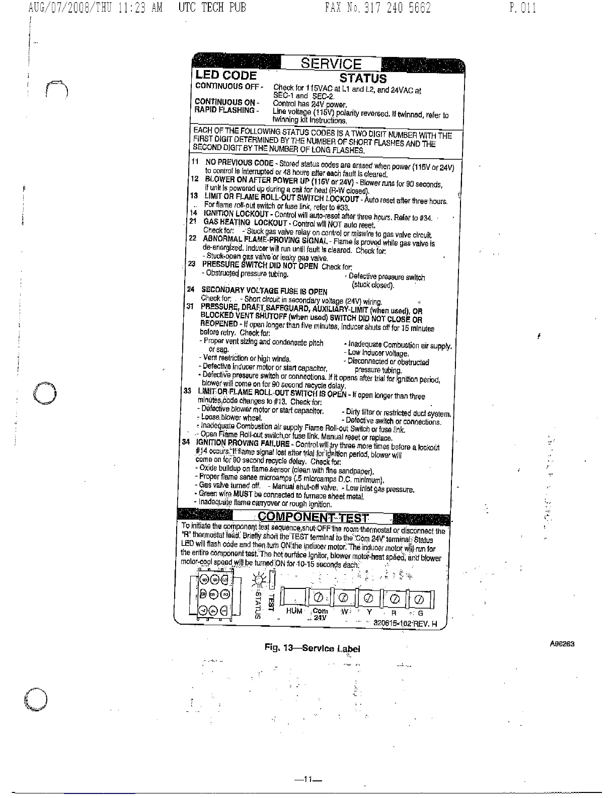 Payne PG8DAA - Component Test Procedure; Service Label and LED Status Codes