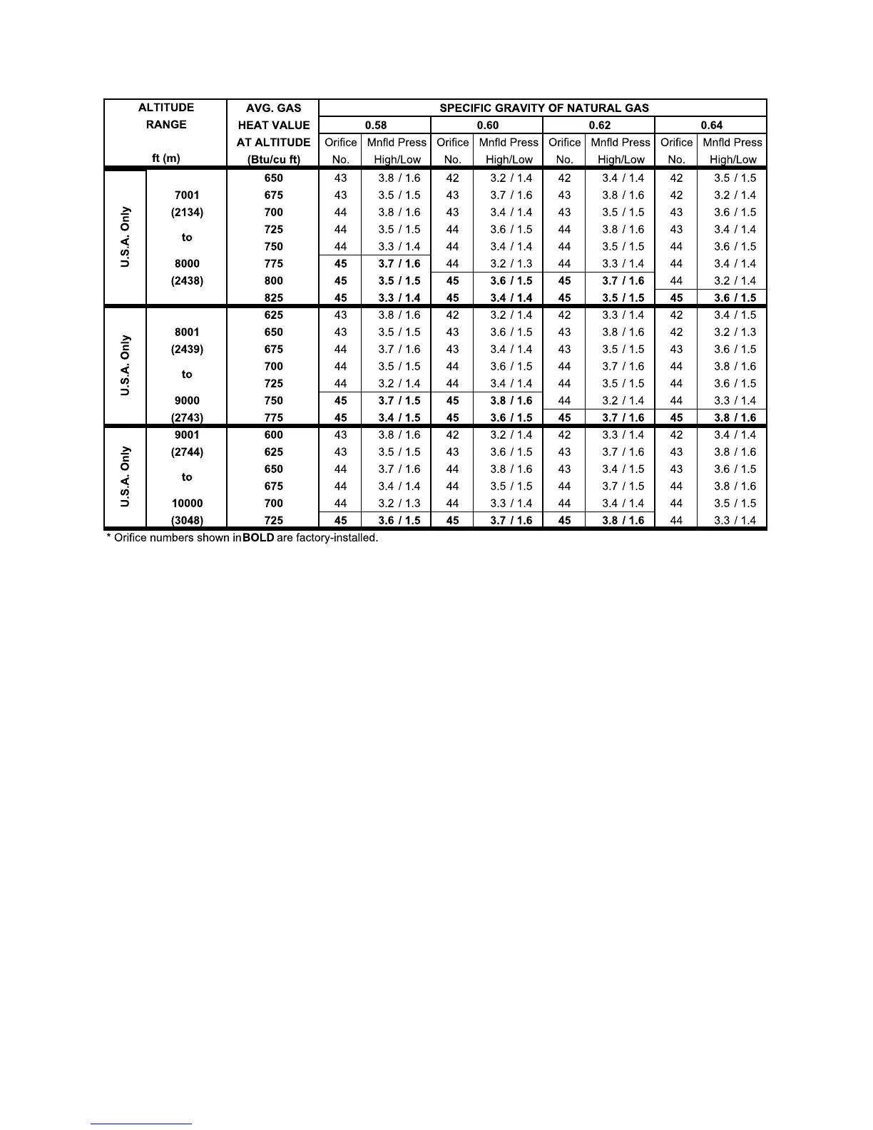 Table 15 --- Model PG9MXA Orifice Size and High/Low-Heat Manifold Pressures for Correct Inputs (Continued)