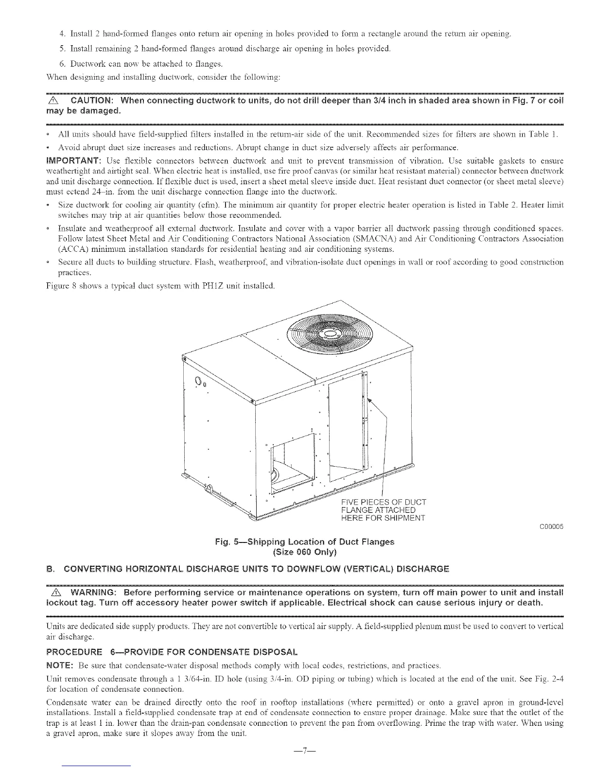 L,_ CAUTION: When connecting ductwork to units, do not drii[ deeper than 3/4 inch in shaded area shown in Fig. 7 or coi[