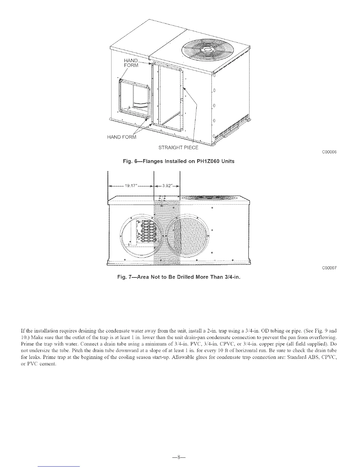 If the installation requires draining the condensate water away fi'om the unit, install a 2°in trap using a 3/4-in. OD robing or pipe. (See Fig 9 and