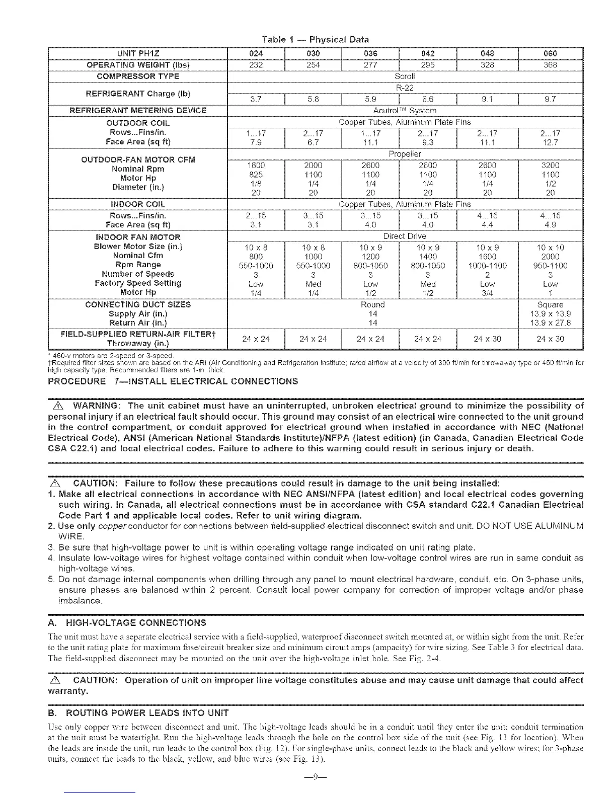 to the unit rating plate for maximum/i_seicircuit breaker size and minimum circuit amps (ampacity) for wire sizing. See Table 3 for electrical data.