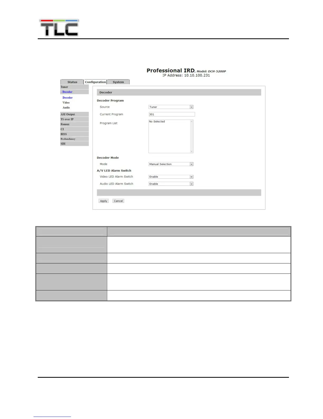 To configure the decoder source, user can select Tuner Input, ASI-1 Input, ASI-2