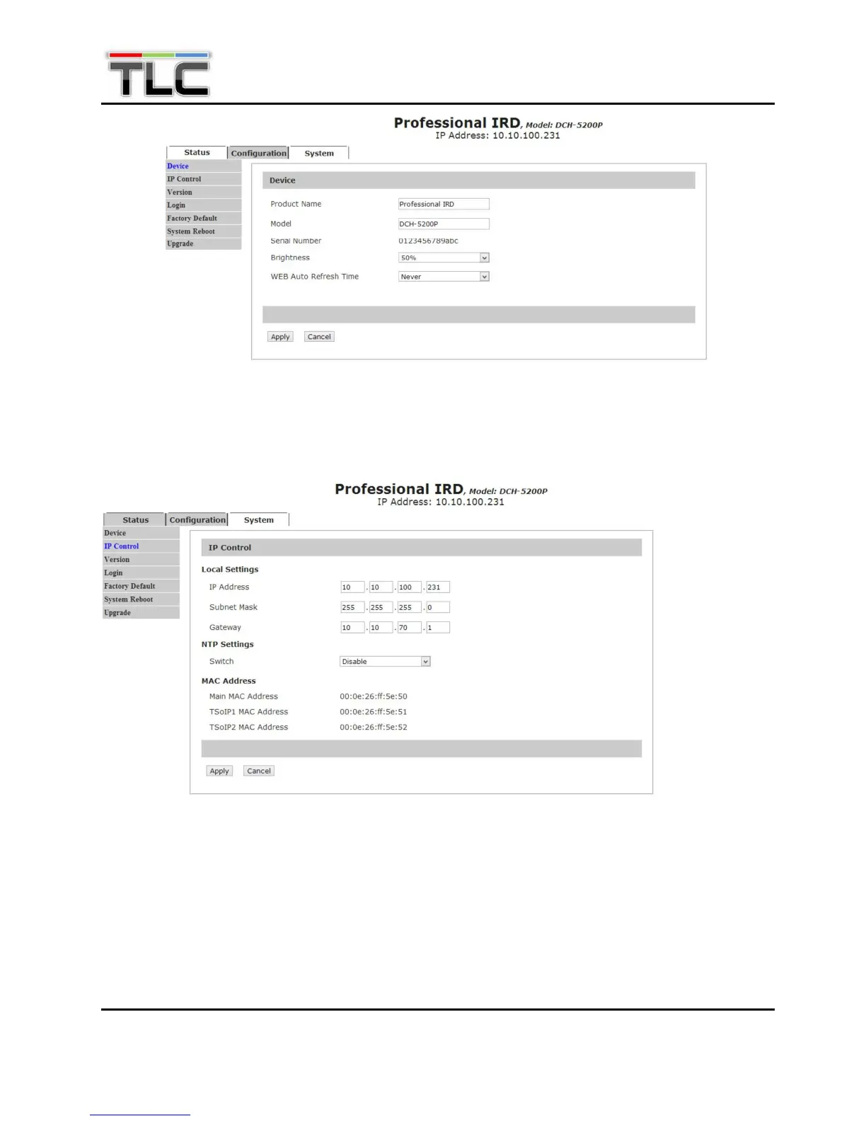 In IP Control page, user can set the network management parameters and active NTP function. Click