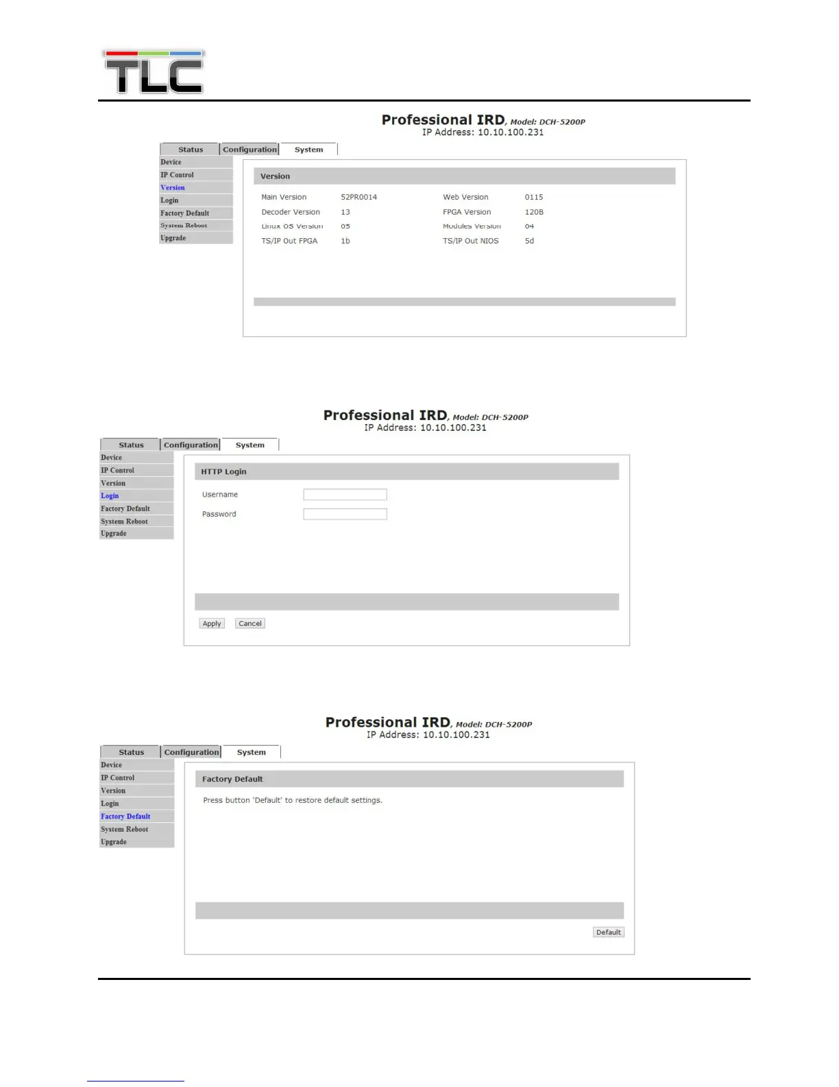 In Factory Default page, user can restore factory default configuration of DCH-5200P.