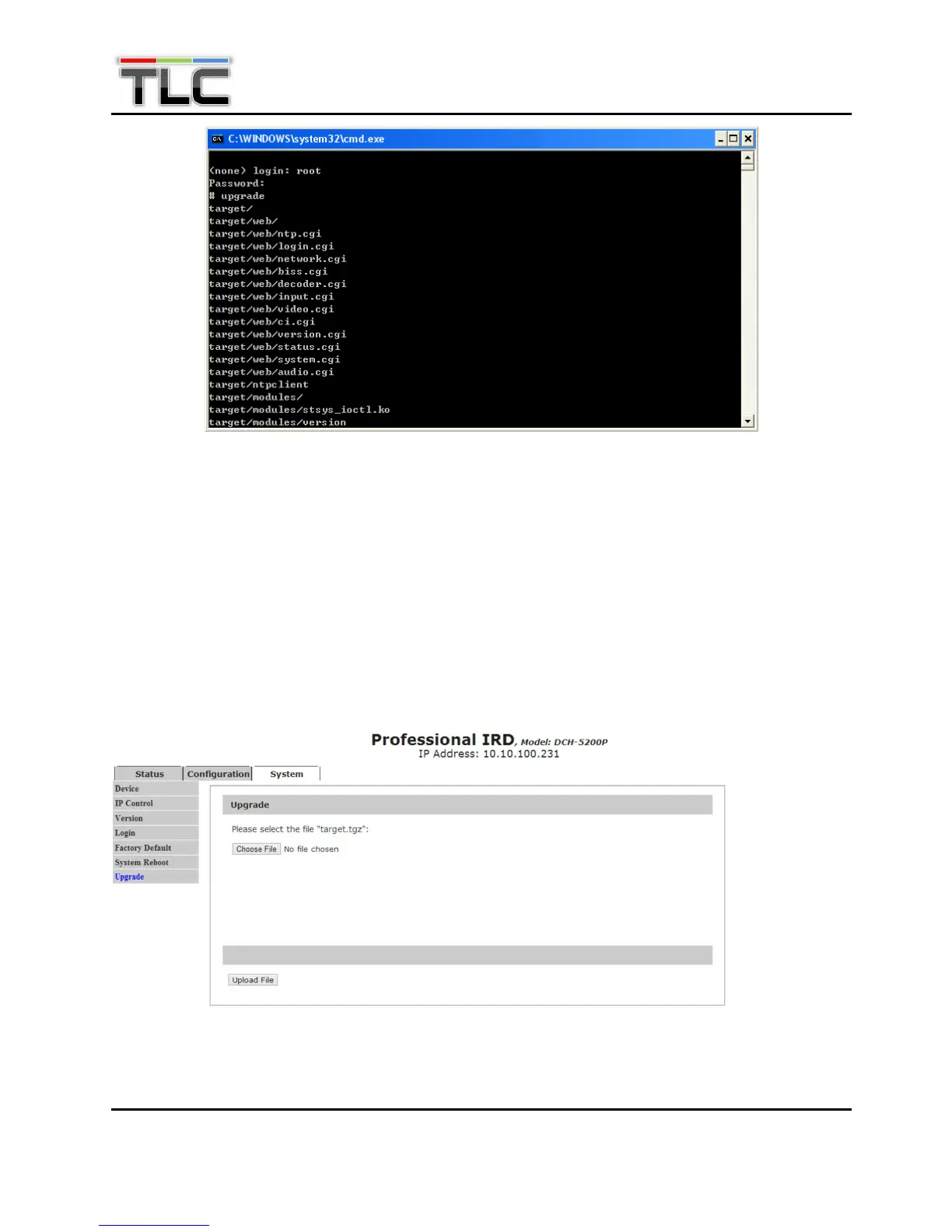 Browse the file named “Target.tgz”, click Upload file button, then the firmware is automatically