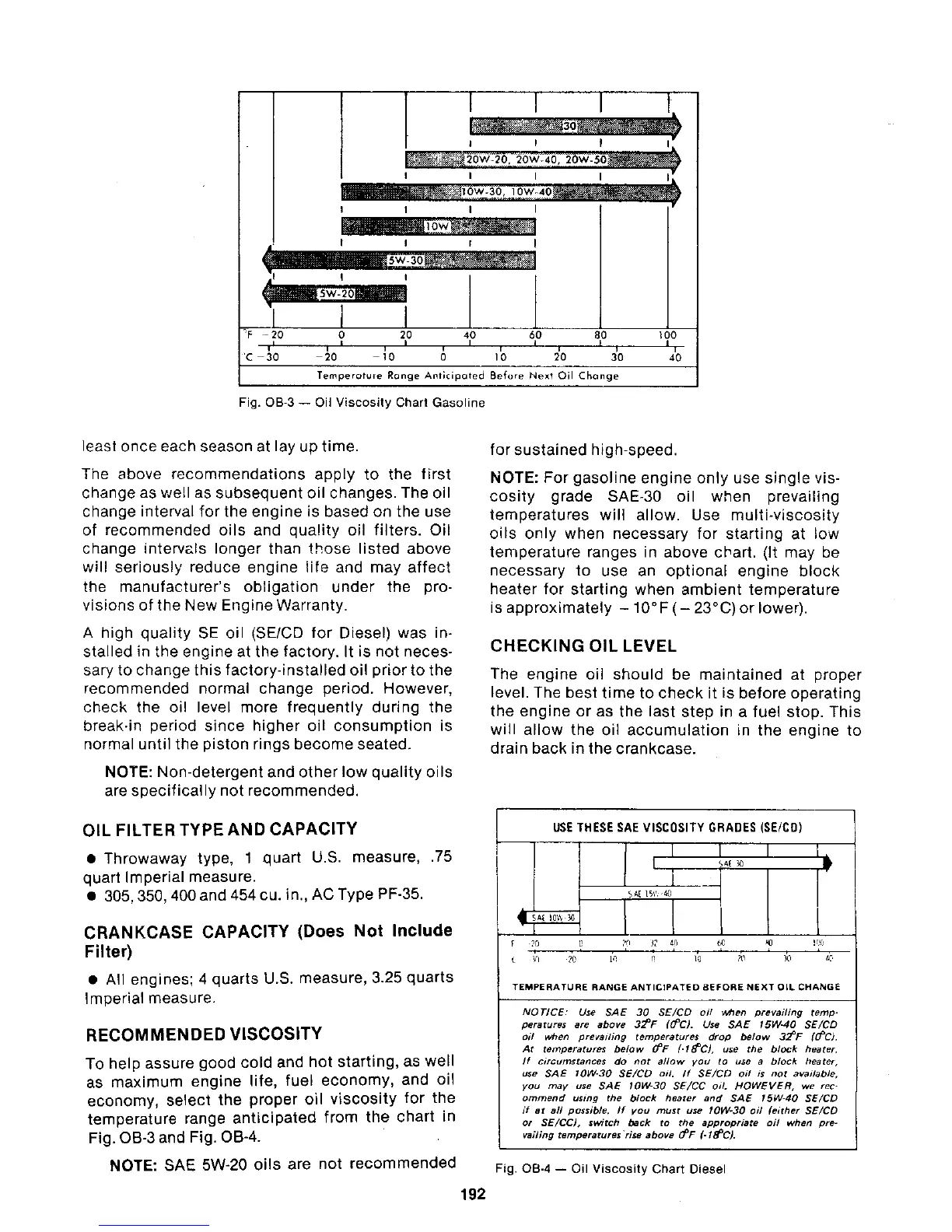 PCM 302 - Oil Filter Type and Capacity; Crankcase Capacity; Recommended Viscosity; Checking Oil Level