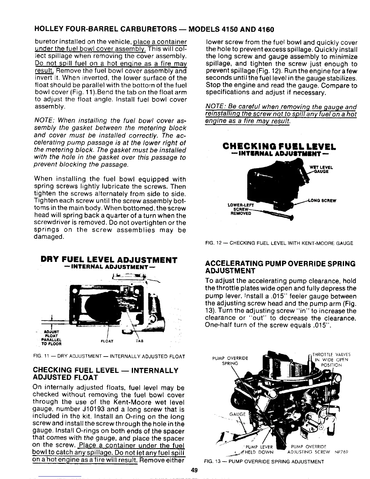 PCM 302 - Checking Fuel Level - Internally Adjusted Float (4150, 4160); Accelerating Pump Override Spring Adjustment (4150, 4160)