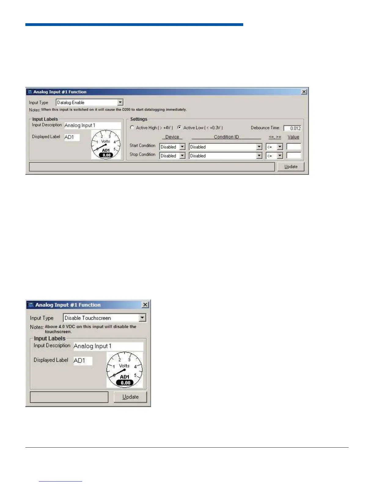 and stop condition to disabled. To have the dash start logging based on a particular input, select the input from the drop