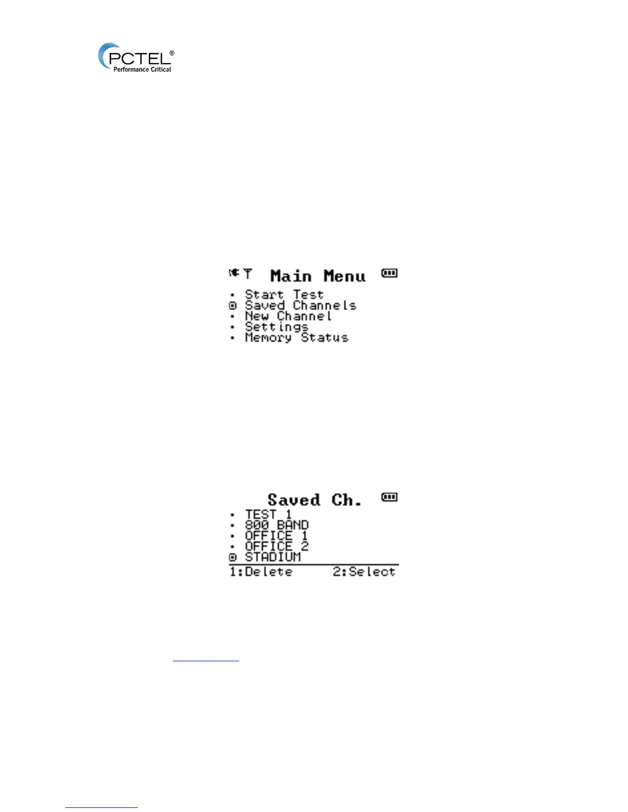 This menu contains saved test channels including all previously saved configurations. Up to 24