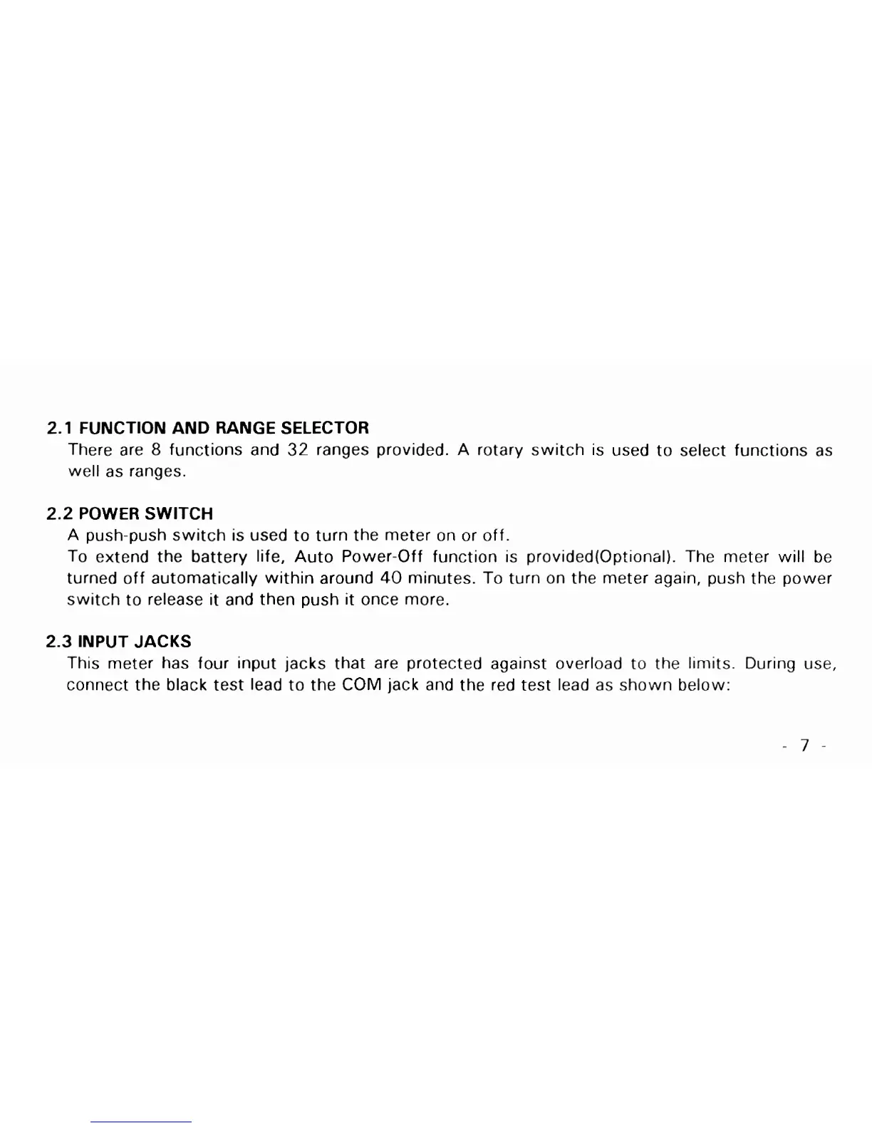 This meter has four input jacks that are protected against overload to the limits. During use,