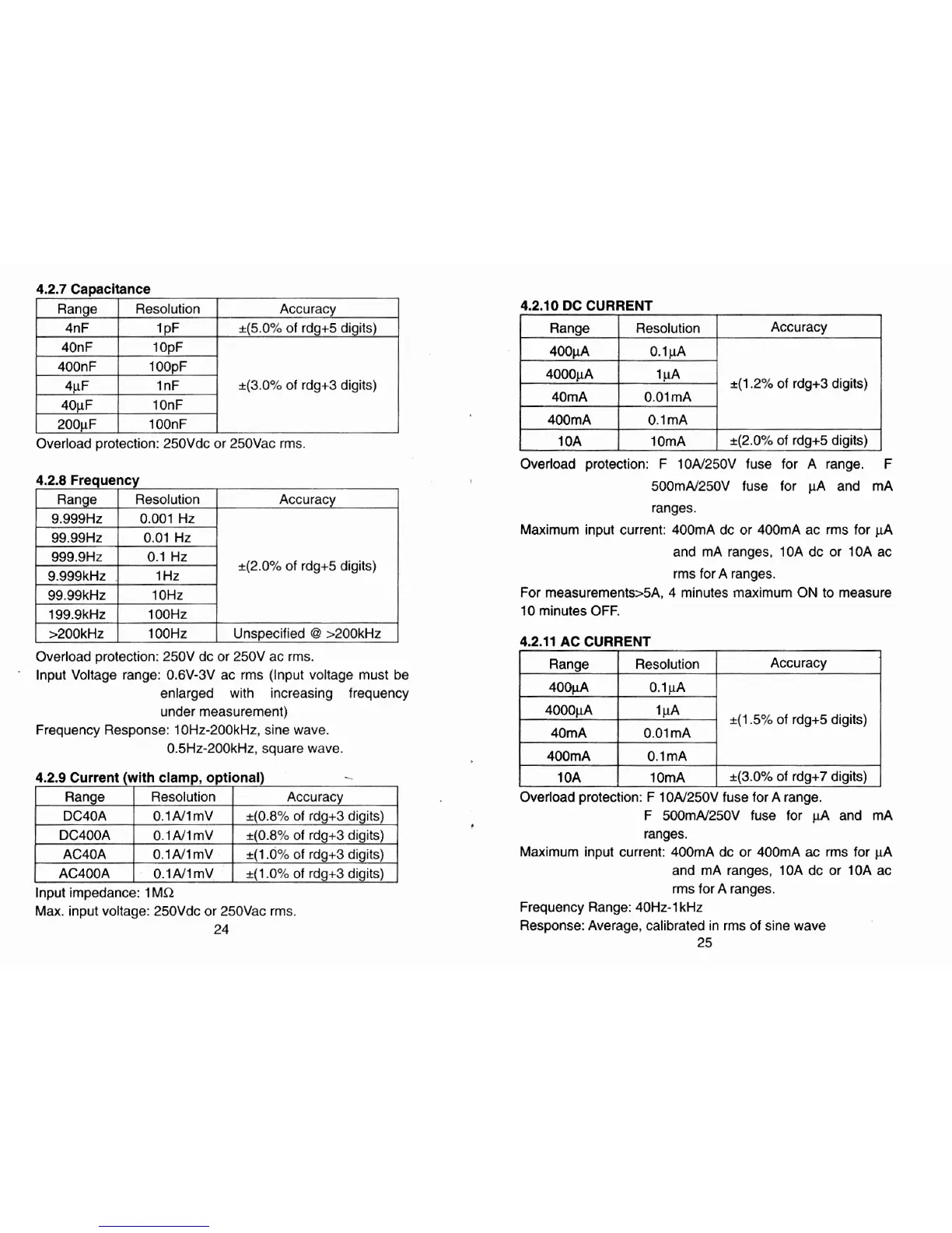 and mA ranges, 10A dc or 10A ac
