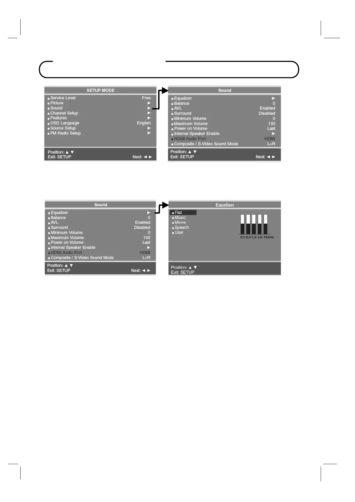 The Flat, Music, Movie, and Speech settings are factory preset sound modes and