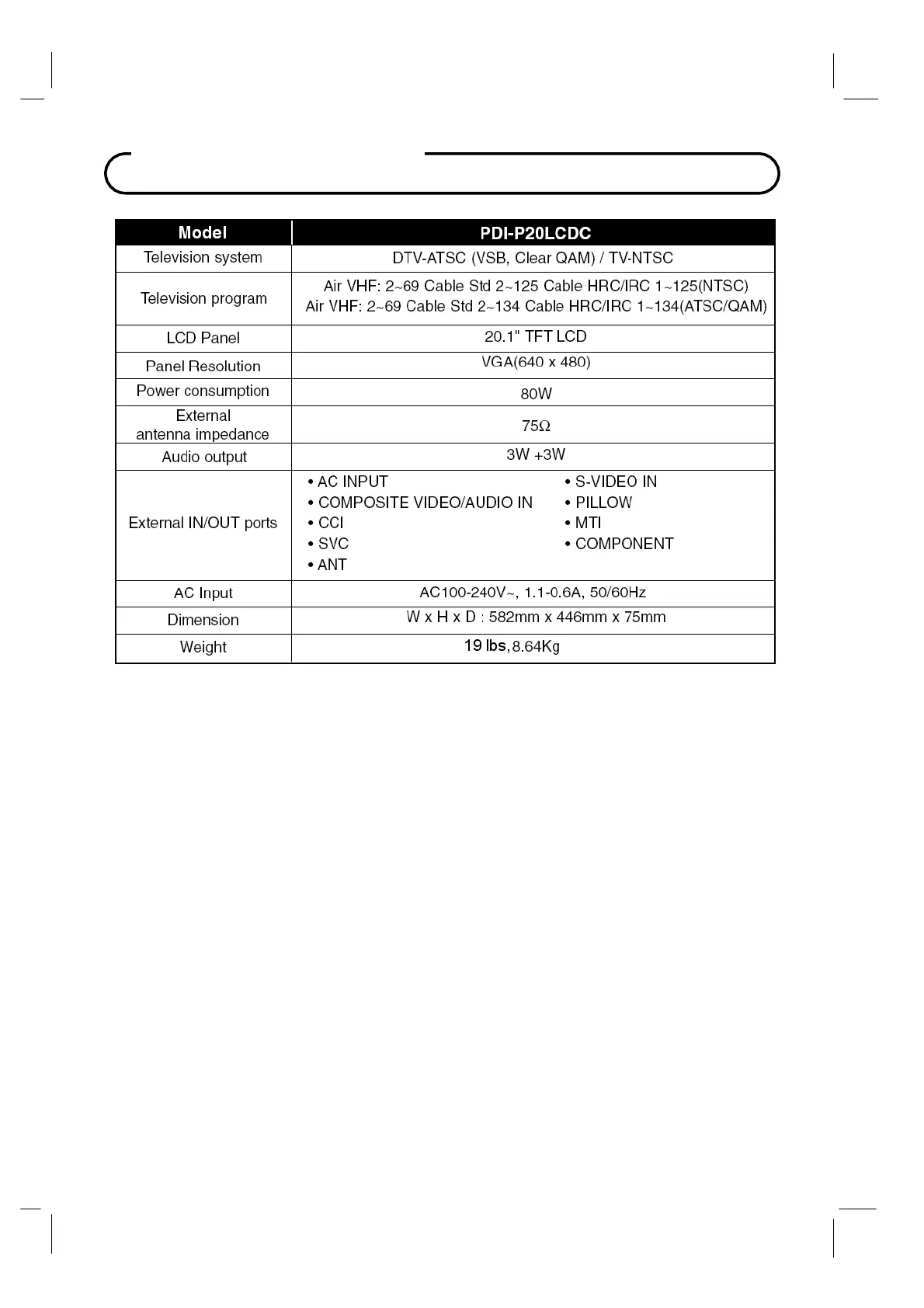 PDi PDI-P20LCDC - Technical Specifications; Model and System Details; Performance and Connectivity; Physical and Electrical Data