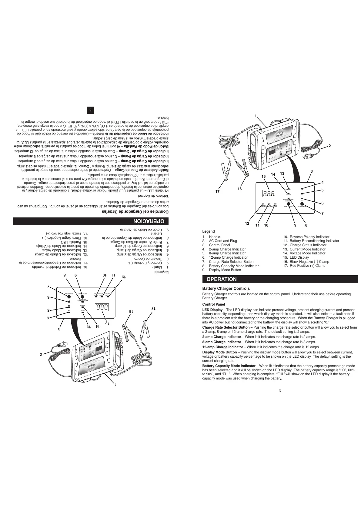 Indicador de Carga de 2-amp – Cuando está encendido indica una tasa de carga de 2 amperios.