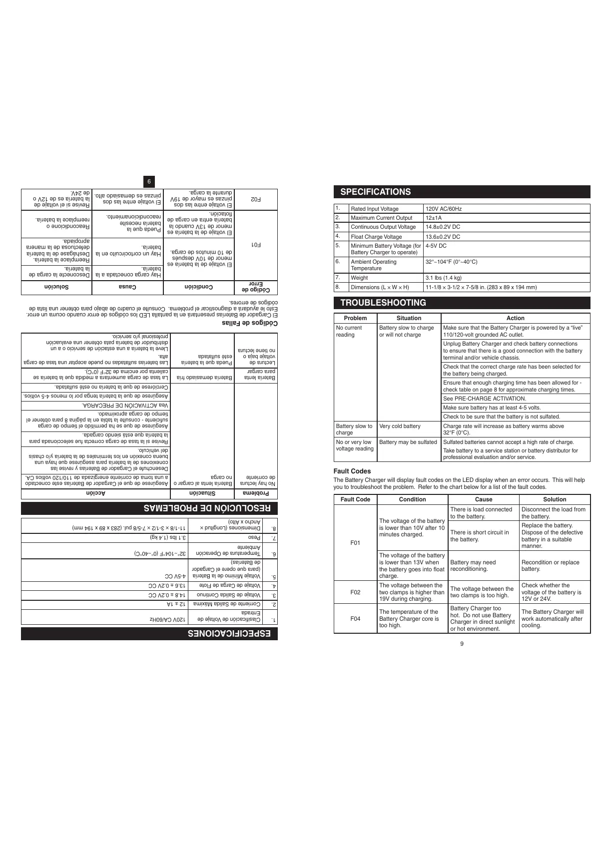 El Cargador de Baterías presentará en la pantalla LED los códigos de error cuando ocurra un error.