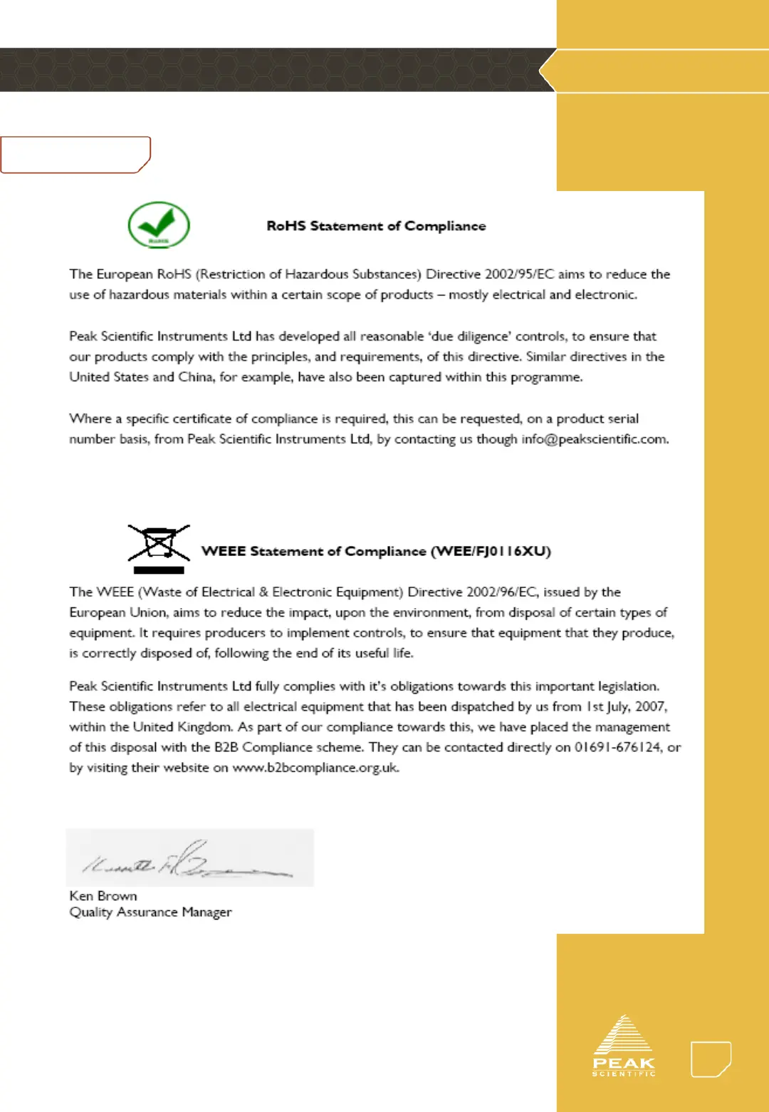Peak Scientific NM20ZA - Declarations of Conformity; RoHS Statement of Compliance; WEEE Statement of Compliance