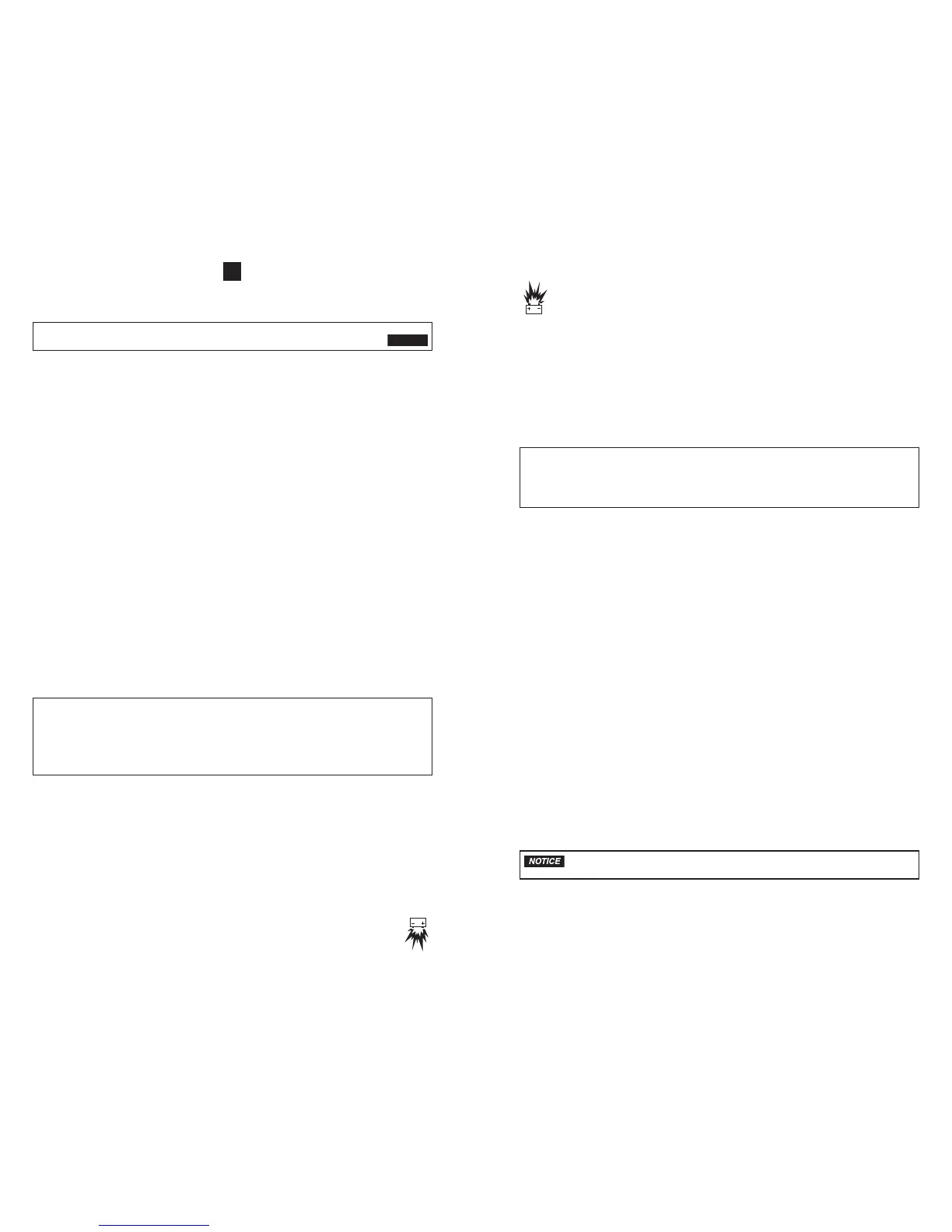 • Never touch battery cables together or to a common piece of metal. Sparking, explosion or