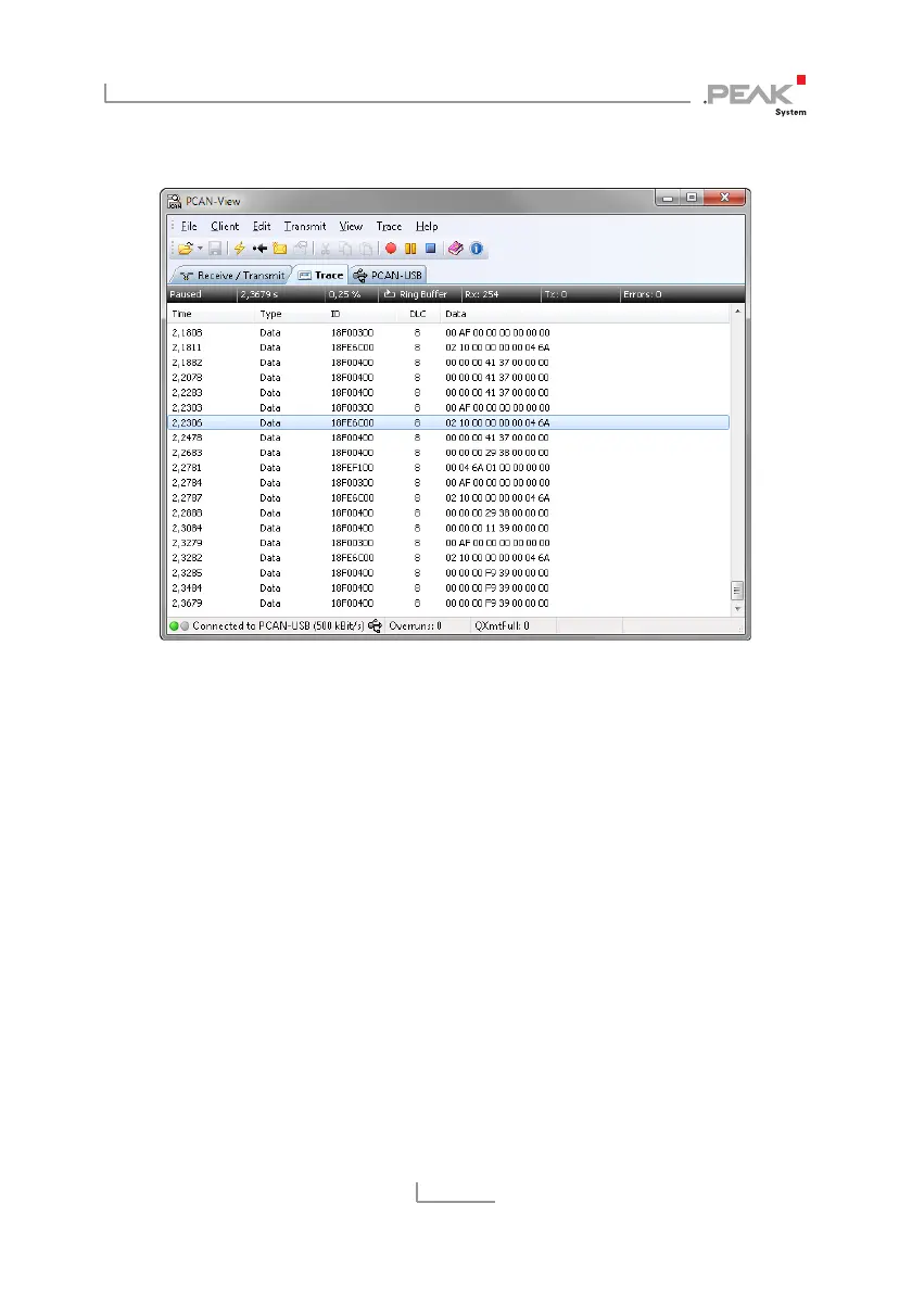 On the Trace tab the data tracer of PCAN-View is used for logging