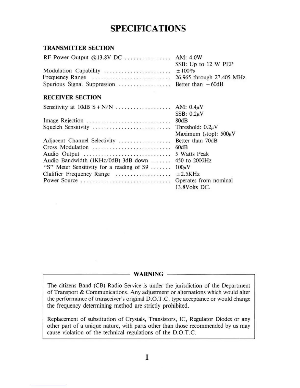 Pearce Simpson ST901 - Specifications; Transmitter Section Specifications; Receiver Section Specifications