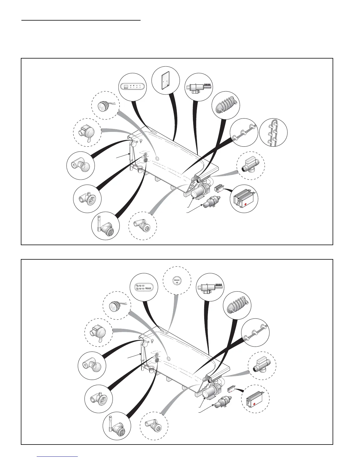 Note: These drawings represent only the major components of the system; the position of the components may vary depending on the bath model.