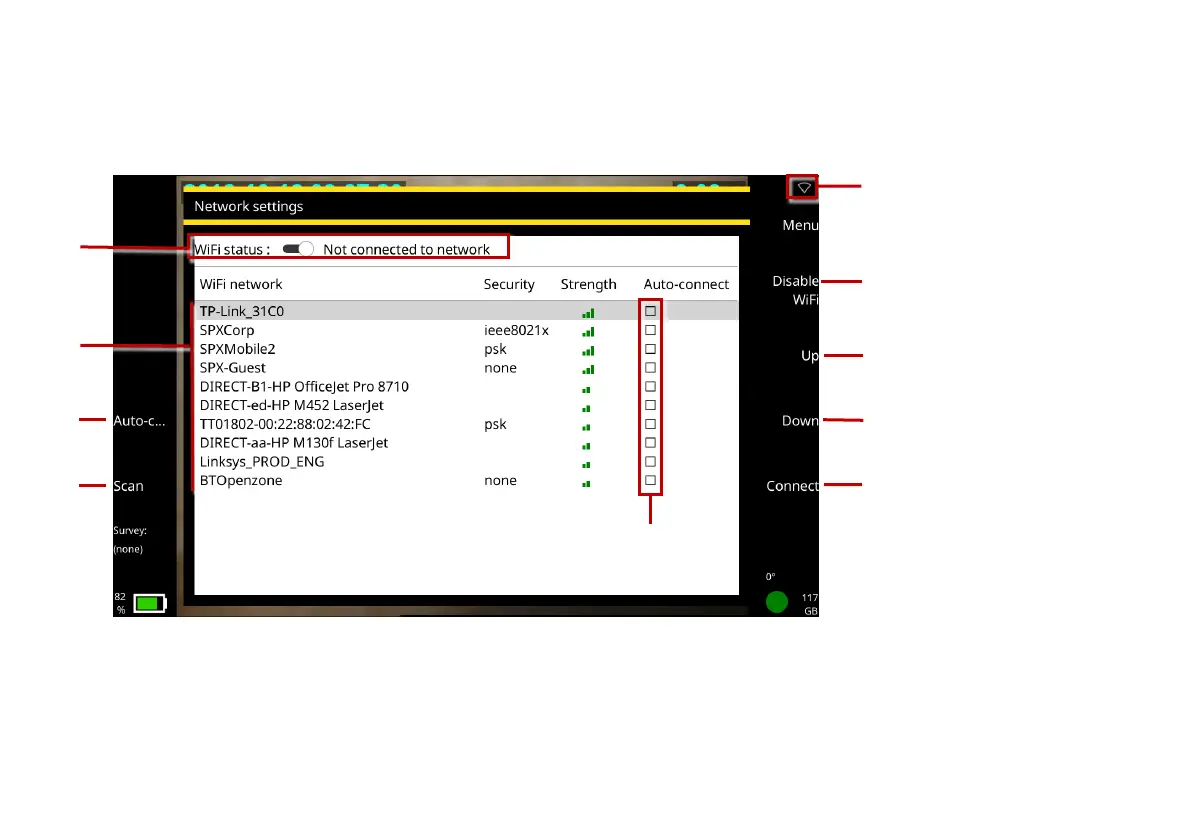 5 Auto-Connect check boxes. 6 WiFi icon. 7 Enable/Disable WiFi button. 8 Up button. 9 Down