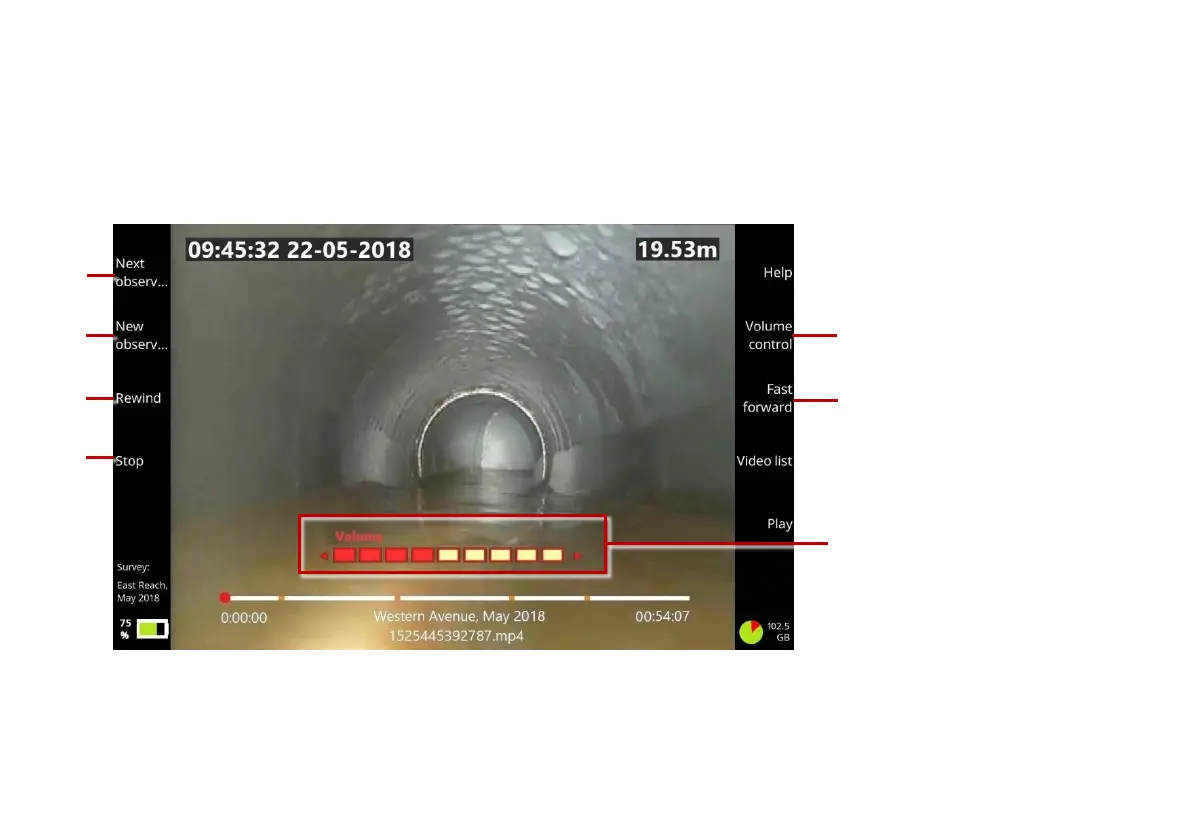 Fig. 6.25: Video playback screen. 1 Next observation button. 2 New observation button.