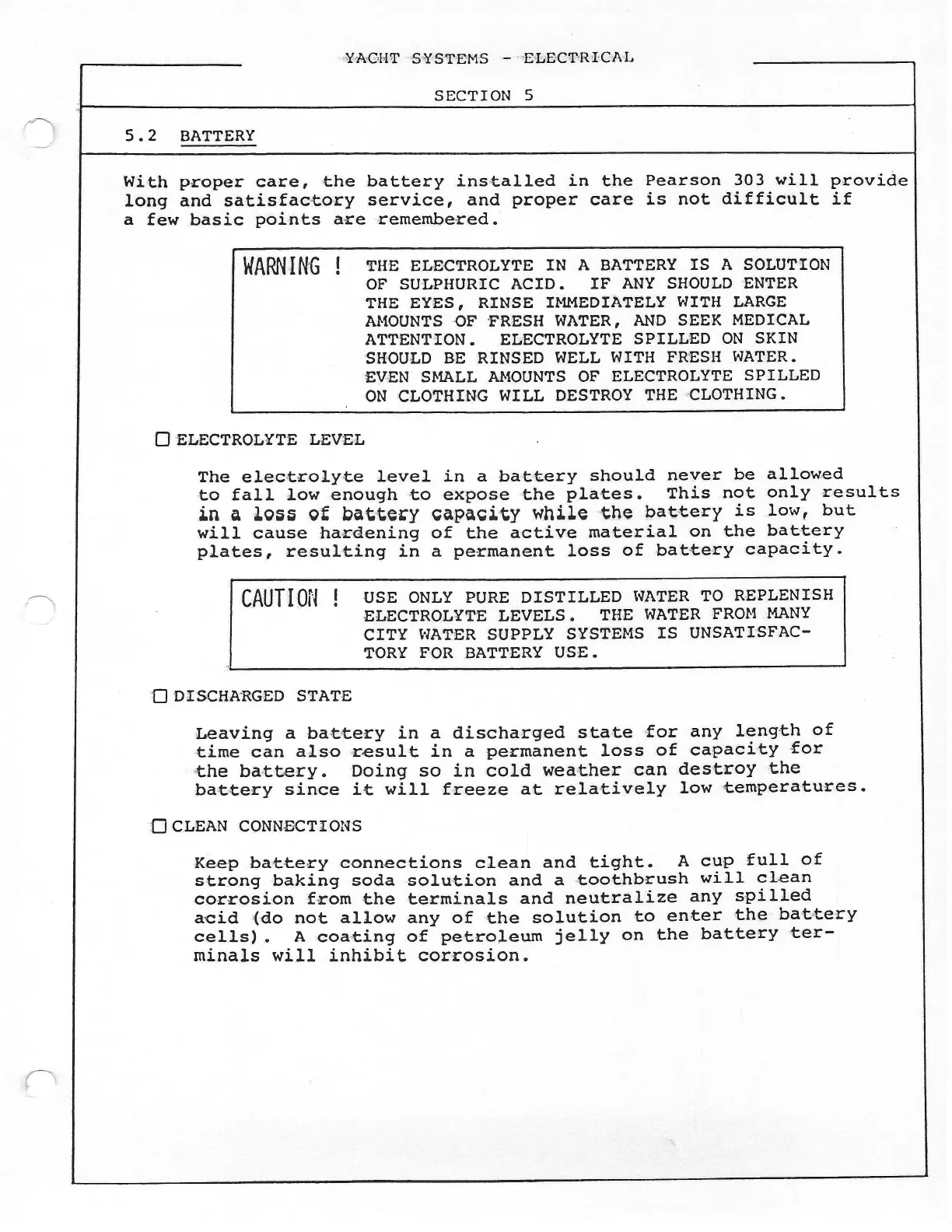 Pearson 303 - Battery; Electrolyte Level; Discharged State; Clean Connections