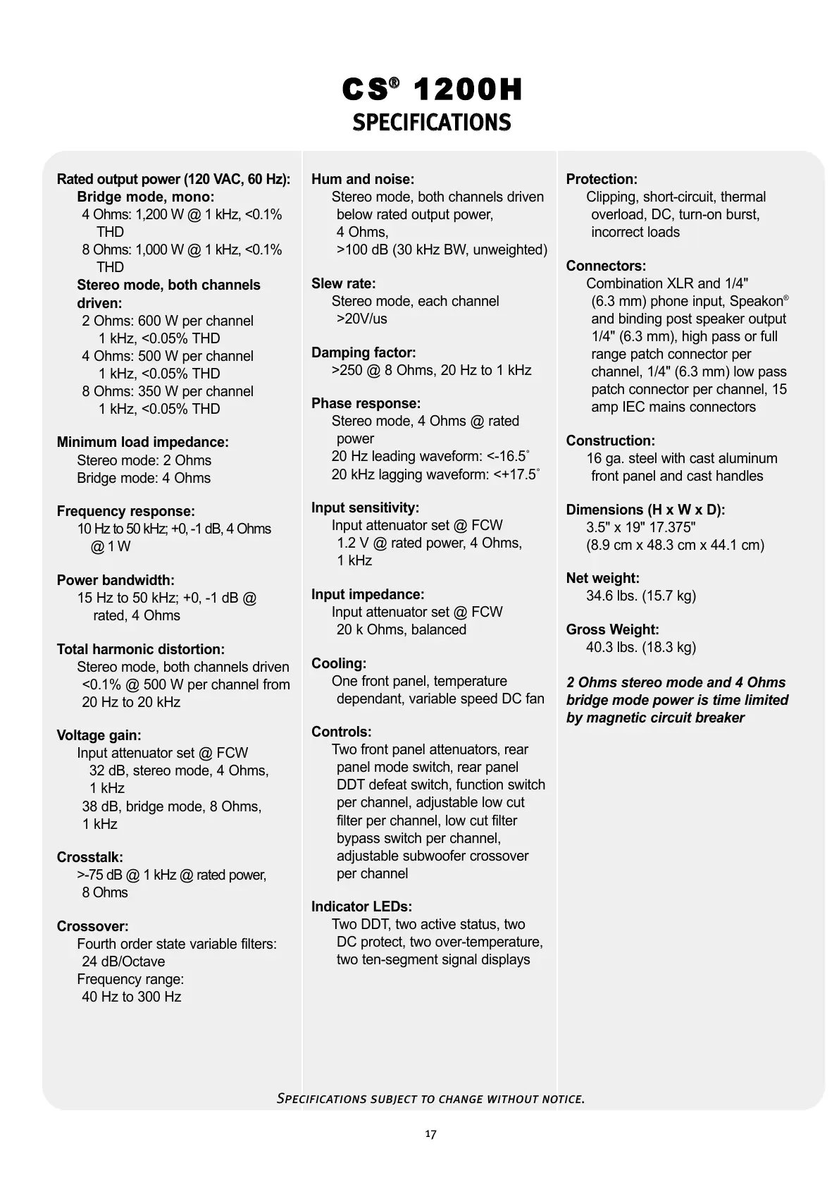 4 Ohms: 1,200 W @ 1 kHz, <0.1%
