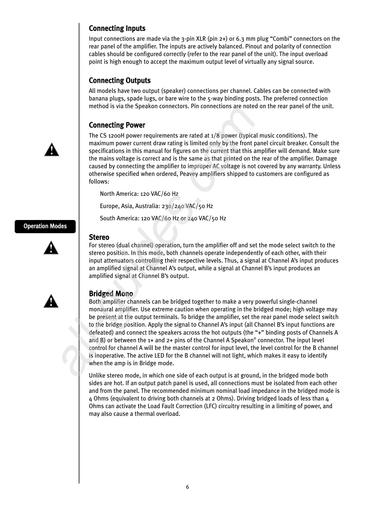 monaural amplifier. Use extreme caution when operating in the bridged mode; high voltage may