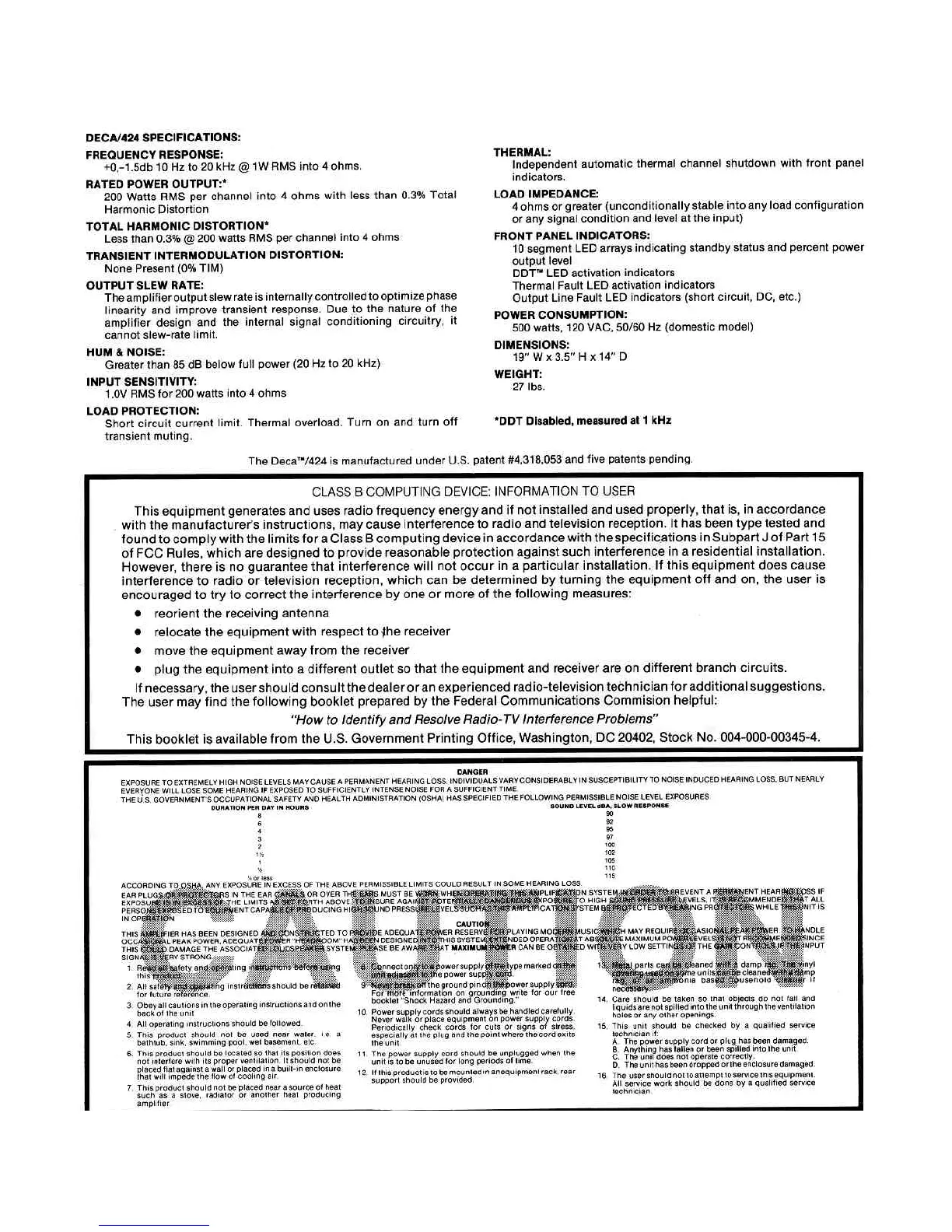 Peavey DECA 424 - Specifications; Class B Computing Device: Information to User; Warning: Danger