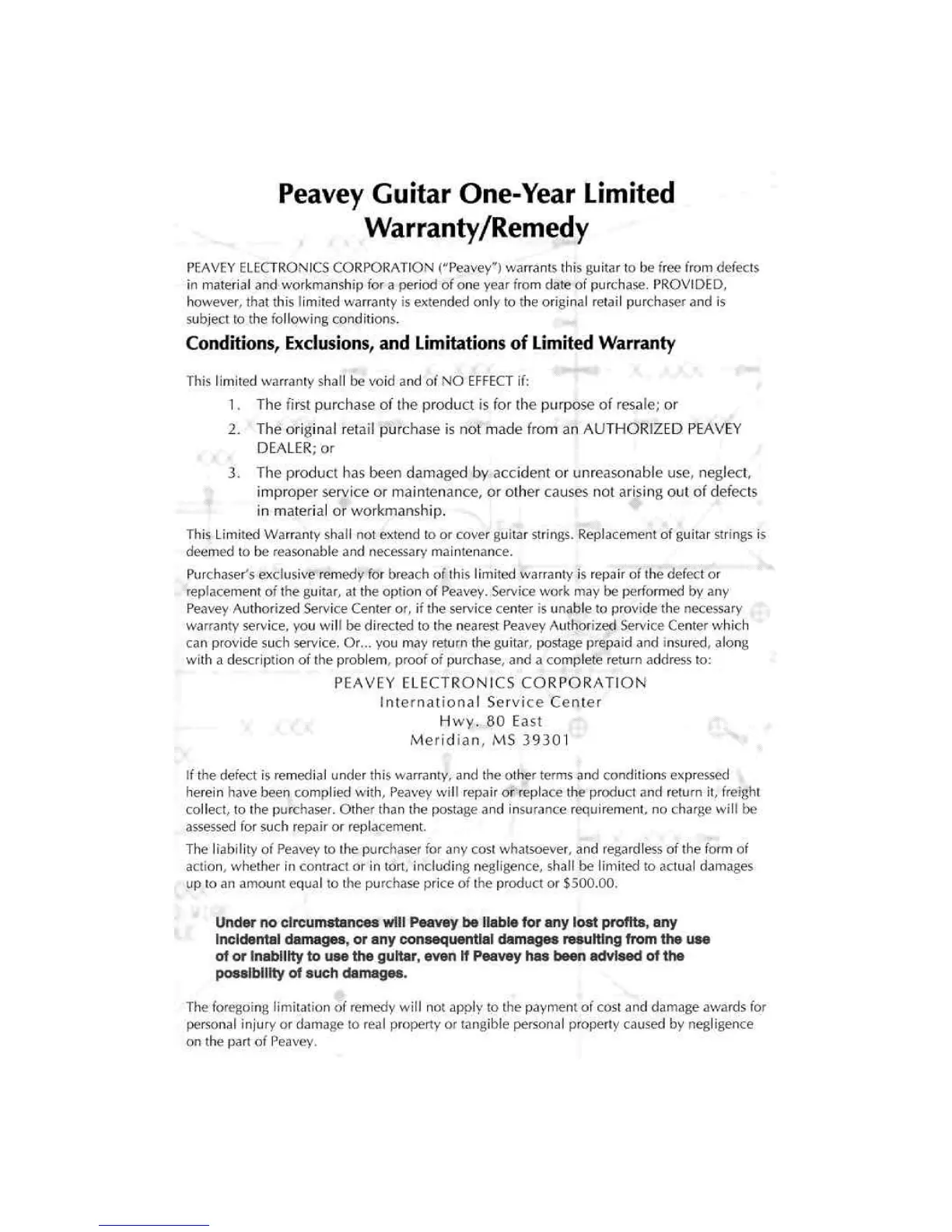 Peavey Fury - Peavey Guitar One-Year Limited Warranty