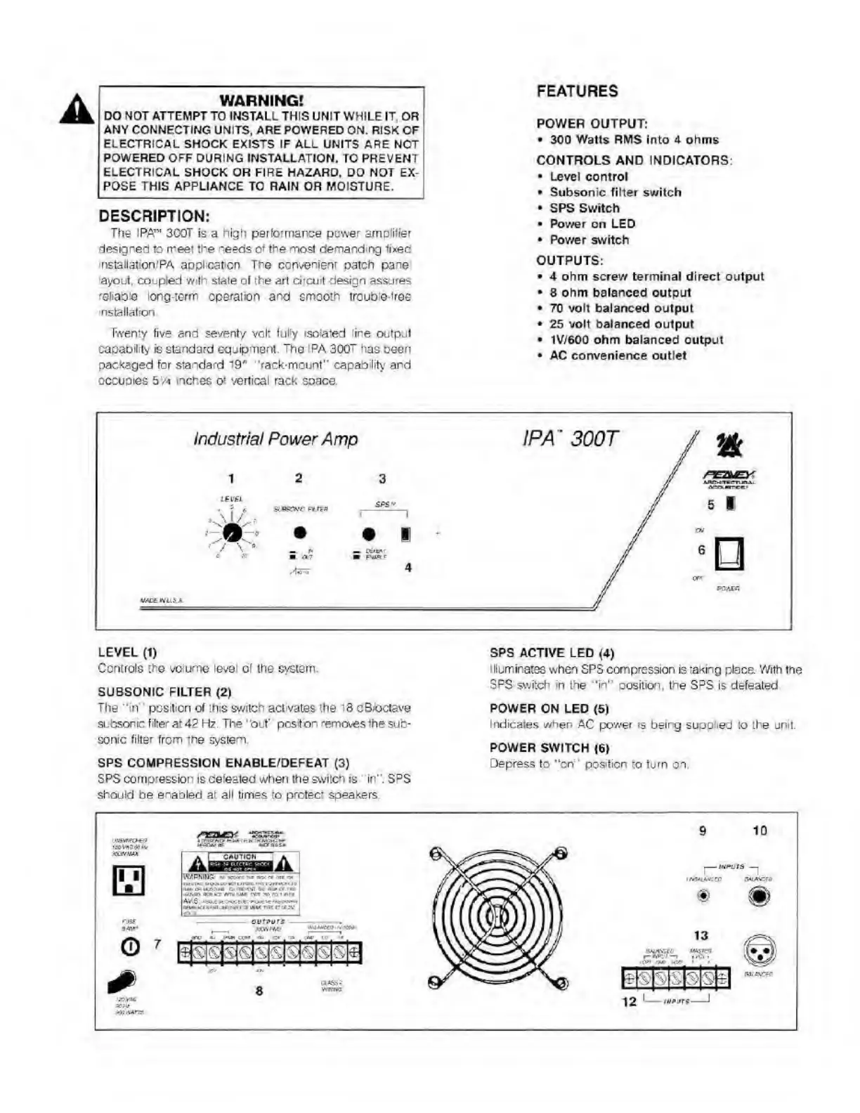 Peavey IPA 300T - Features; Warnings; Power Output; Controls and Indicators