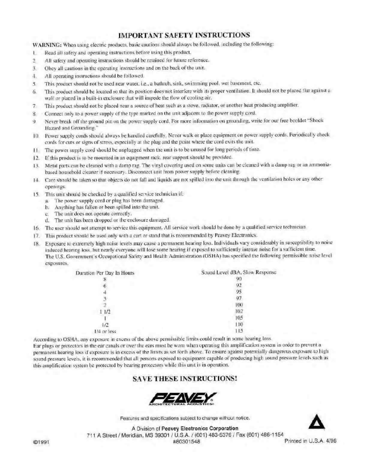 Peavey IPA 300T - Important Safety Instructions