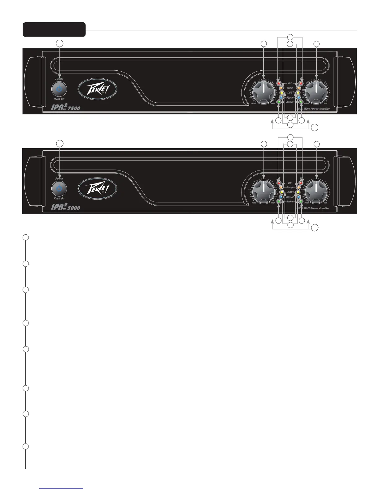 amplifiers feature five front-panel LED indicators per channel: ACTIVE, SIGNAL, DDT