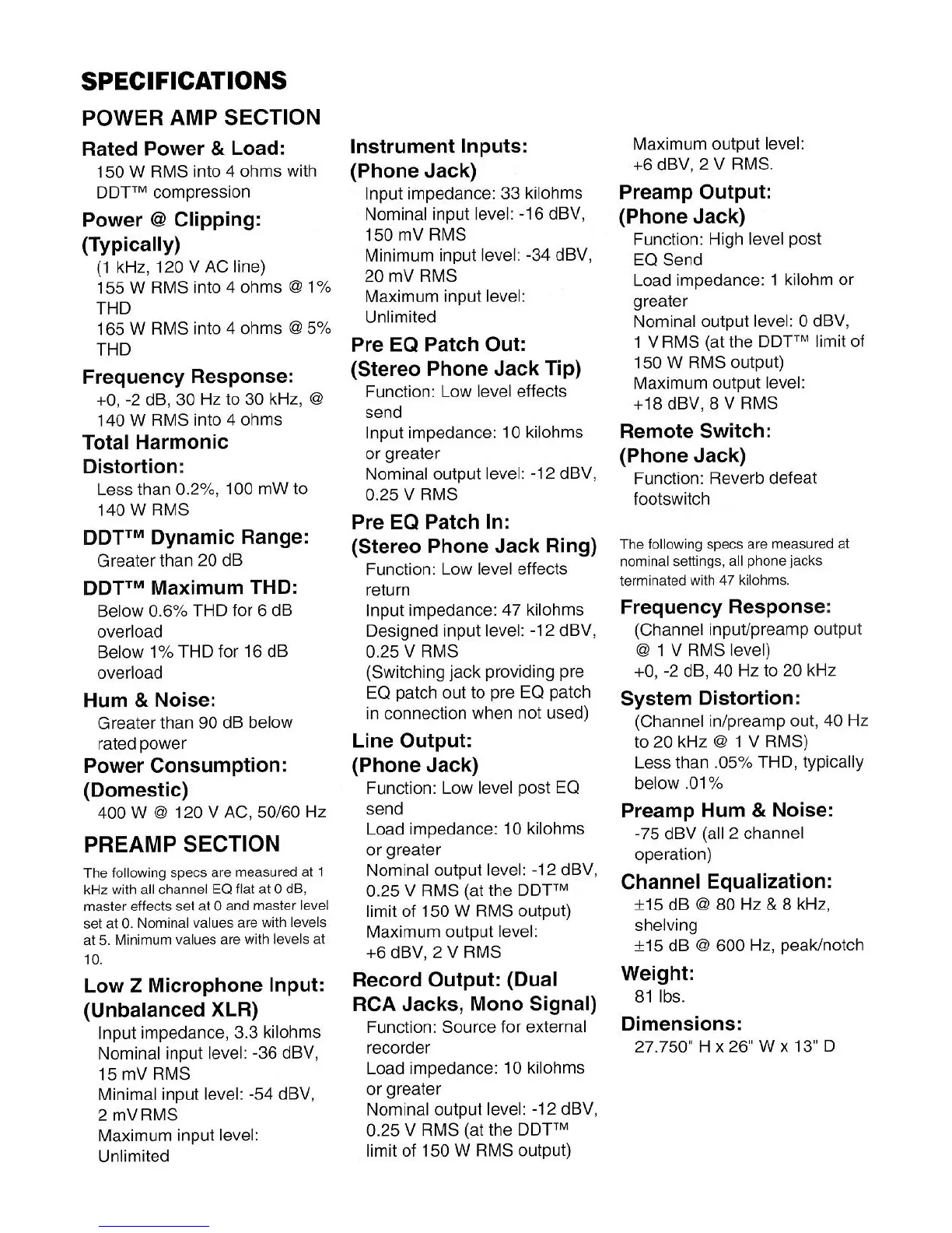 Peavey KB 300 - Specifications; Power Amp Section Specifications; Preamp Section Specifications